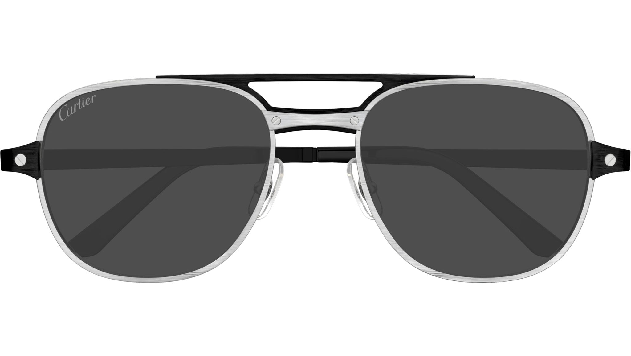 Occhiali da sole Cartier linea Exception modello CT0477S in metallo aviatore codice colore 001 finitura platino spazzolato e spazzolato con aste color nero e lenti color nero polarizzato.