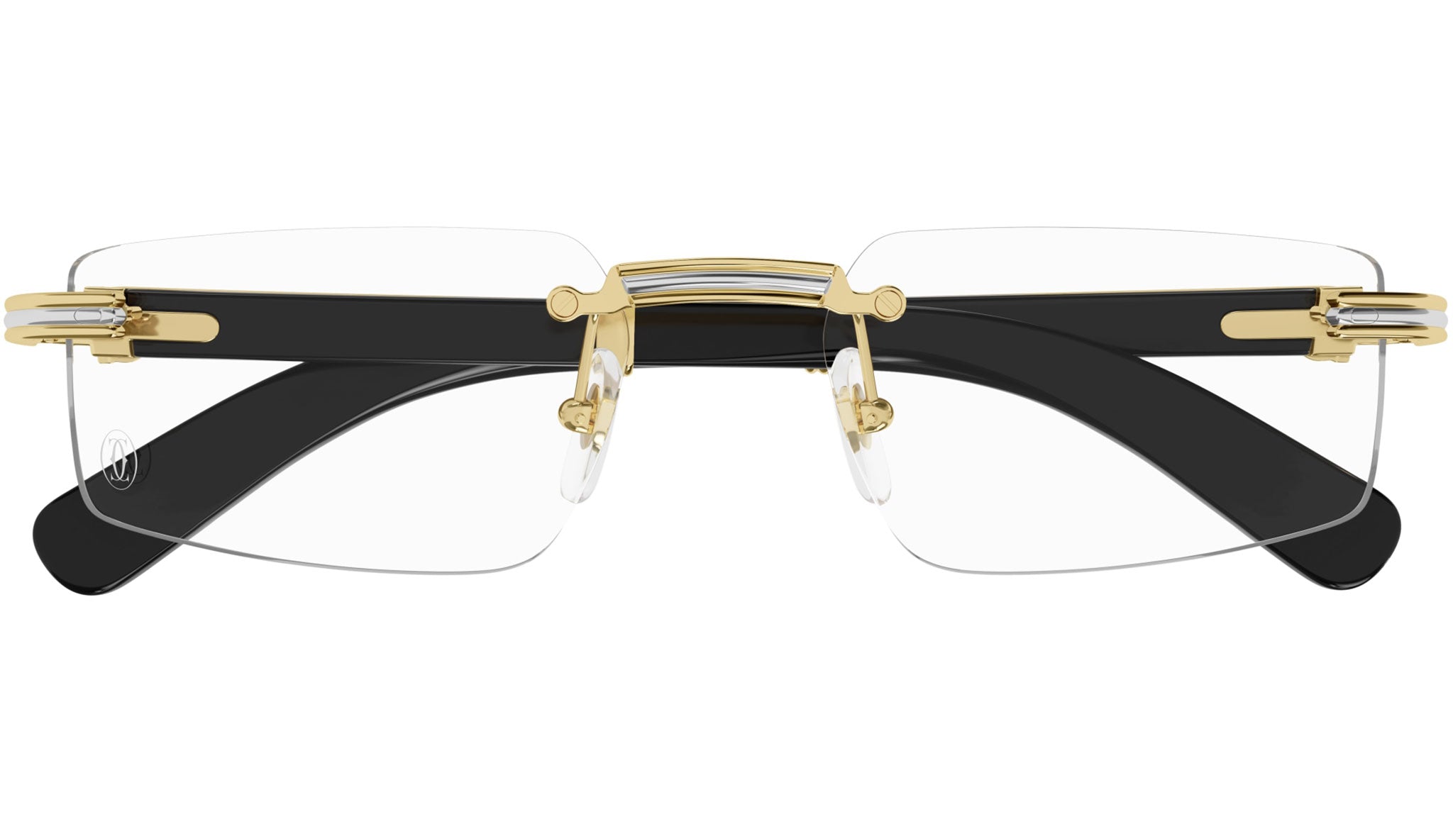 Occhiali da vista Cartier Exception modello CT0485O rectangle in metallo codice colore 003 oro finitura smooth / finitura platino con aste bianco e lenti demo da materiale riciclato con strato HR e filtro AR blu.