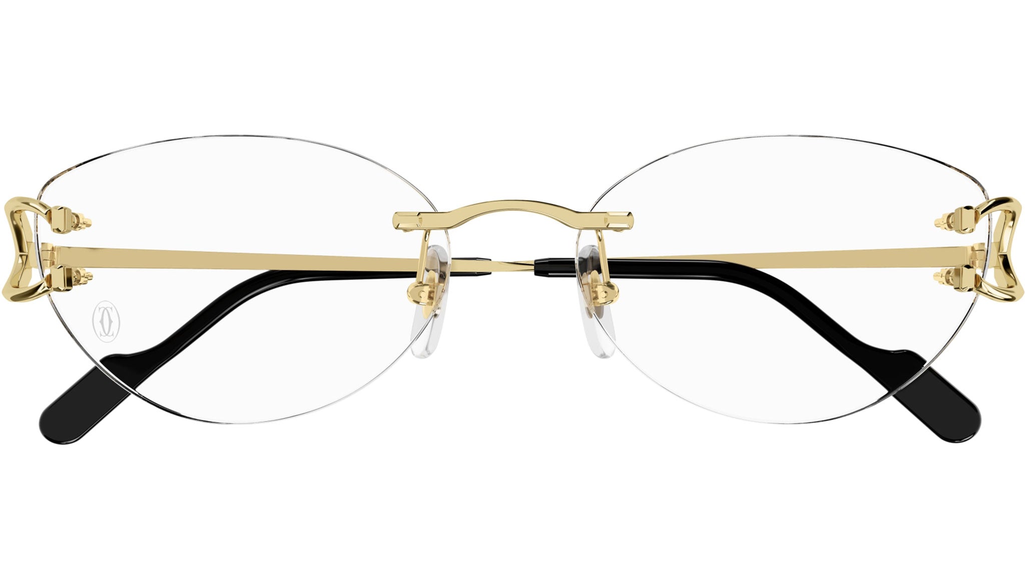 Occhiali da vista Cartier Core Range modello CT0487O cat eye in metallo codice colore 001 oro finitura smooth con aste oro e lenti demo da materiale riciclato con strato HR e filtro AR blu.
