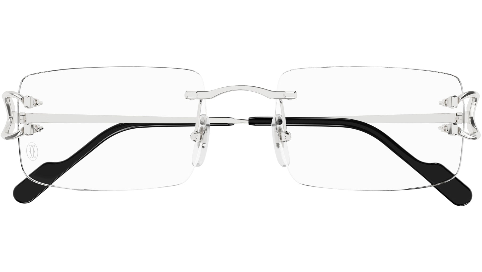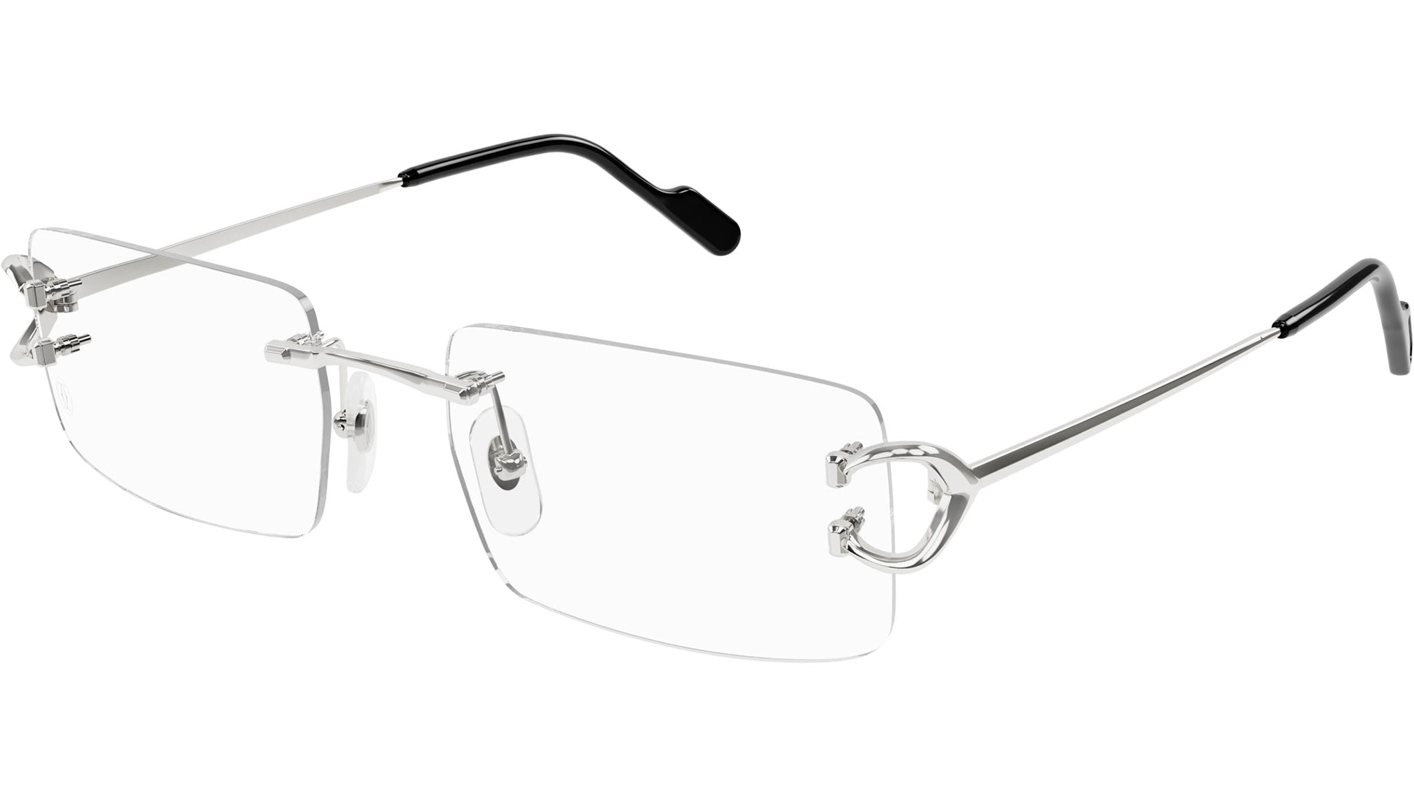 Occhiali da vista Cartier Core Range modello CT0488O rectangle in metallo codice colore 002 finish platino levigato con aste argento e lenti demo da materiale riciclato con strato HR e filtro AR blu.