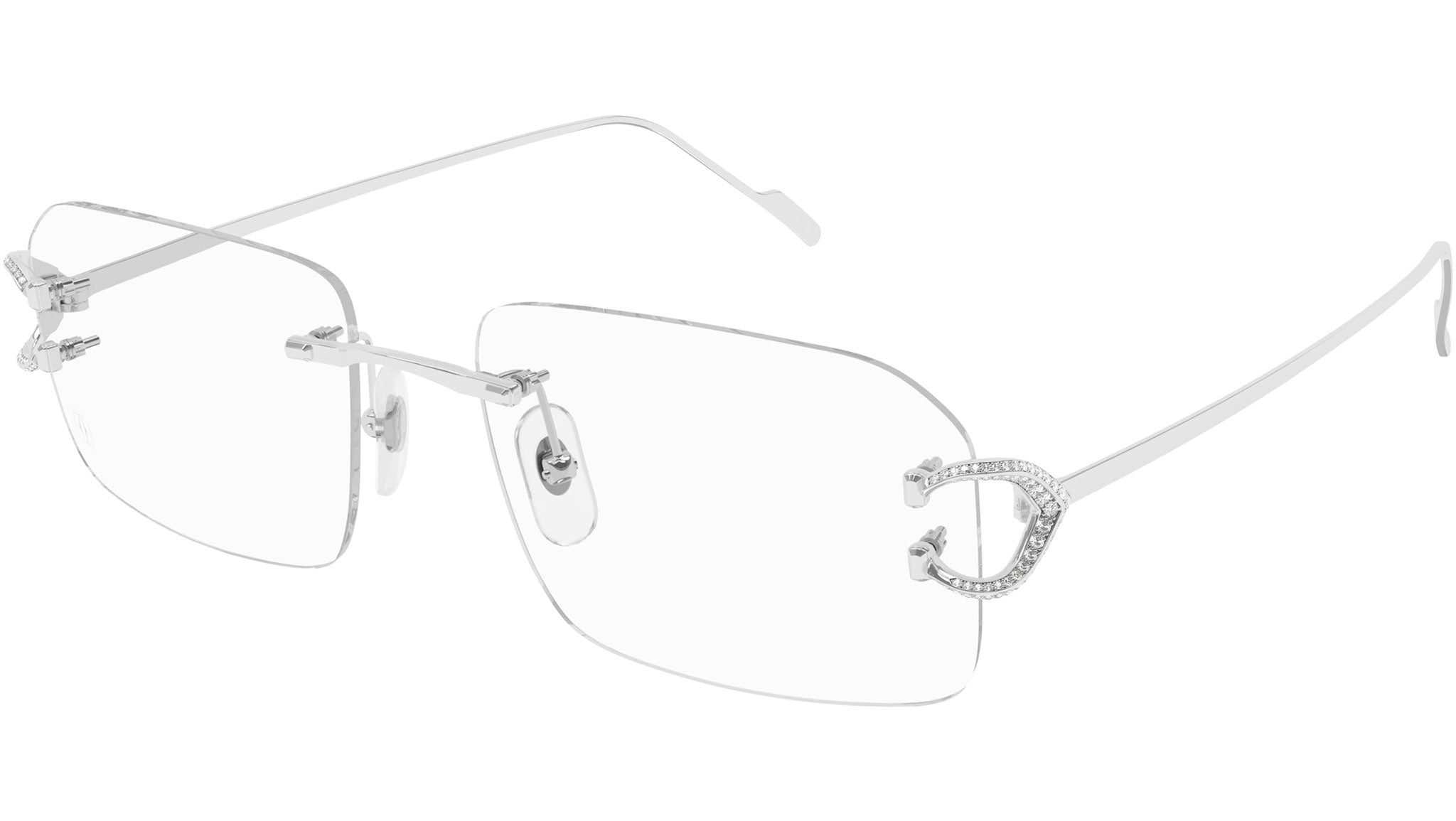 Occhiali da vista Cartier Precious modello CT0489O rectangle in oro codice colore 003 oro bianco tinta unita con aste argento e lenti demo da materiale riciclato con strato HR e filtro AR blu.