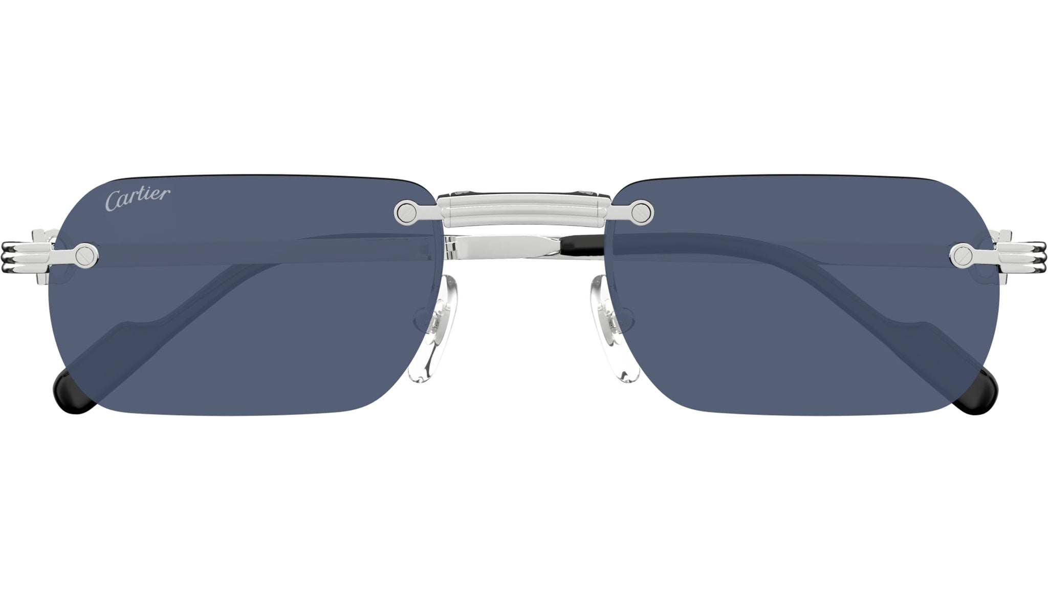 Occhiali da sole Cartier linea Exception modello CT0499S in metallo rettangolare codice colore 002 finish platino levigato con aste color argento e lenti color blu.