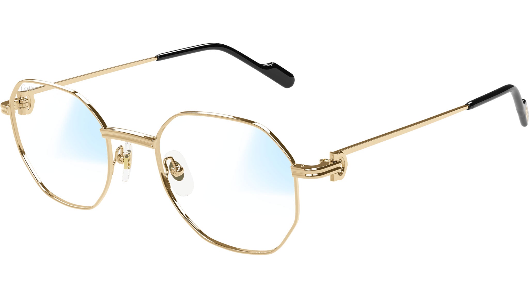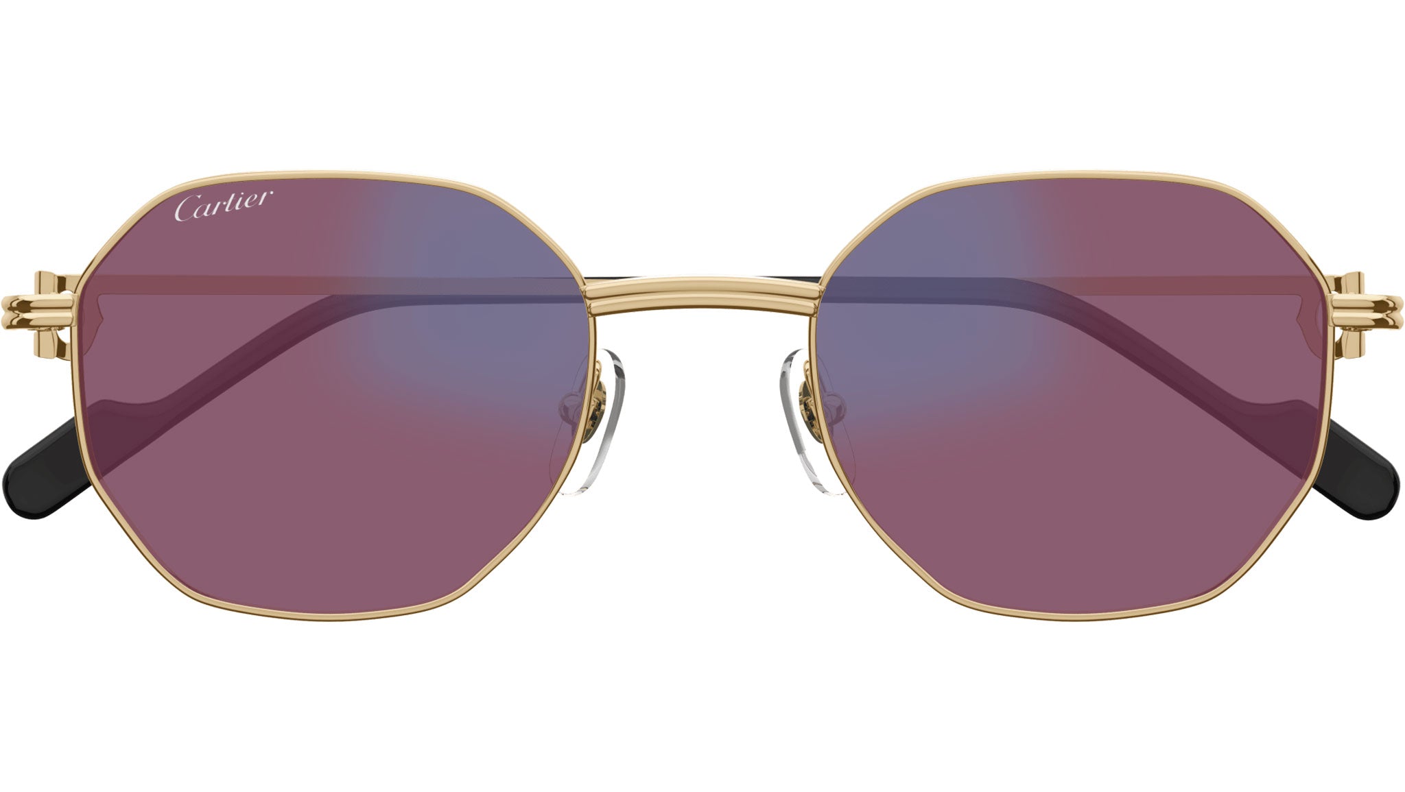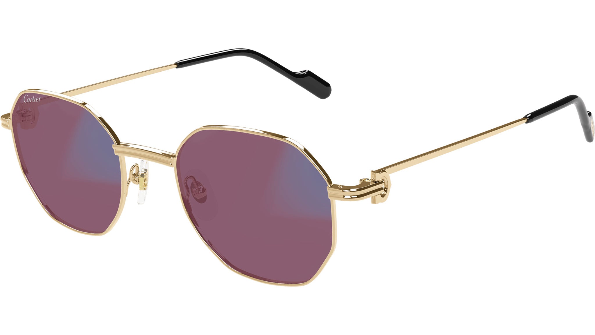 Occhiali da sole Cartier linea Core Range modello CT0500S in metallo pantos codice colore 005 oro finitura smooth con aste color oro e lenti color da trasparente a bordeaux fotocromatico + riduttore AR mac 4 blu.
