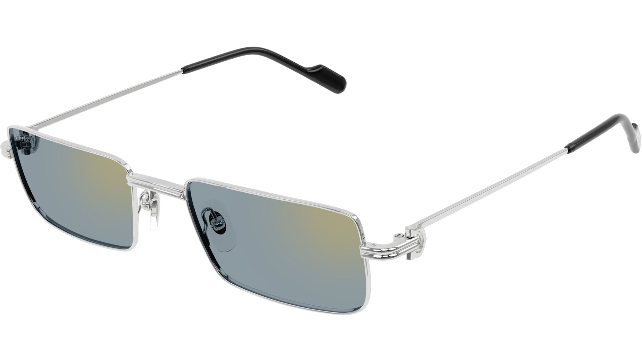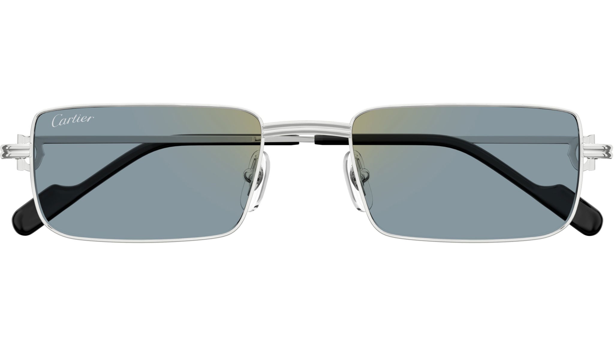 Occhiali da sole Cartier linea Core Range modello CT0501S in metallo rettangolare codice colore 004 finish platino levigato con aste color argento e lenti color azzurro polvere con riflessi dorati.