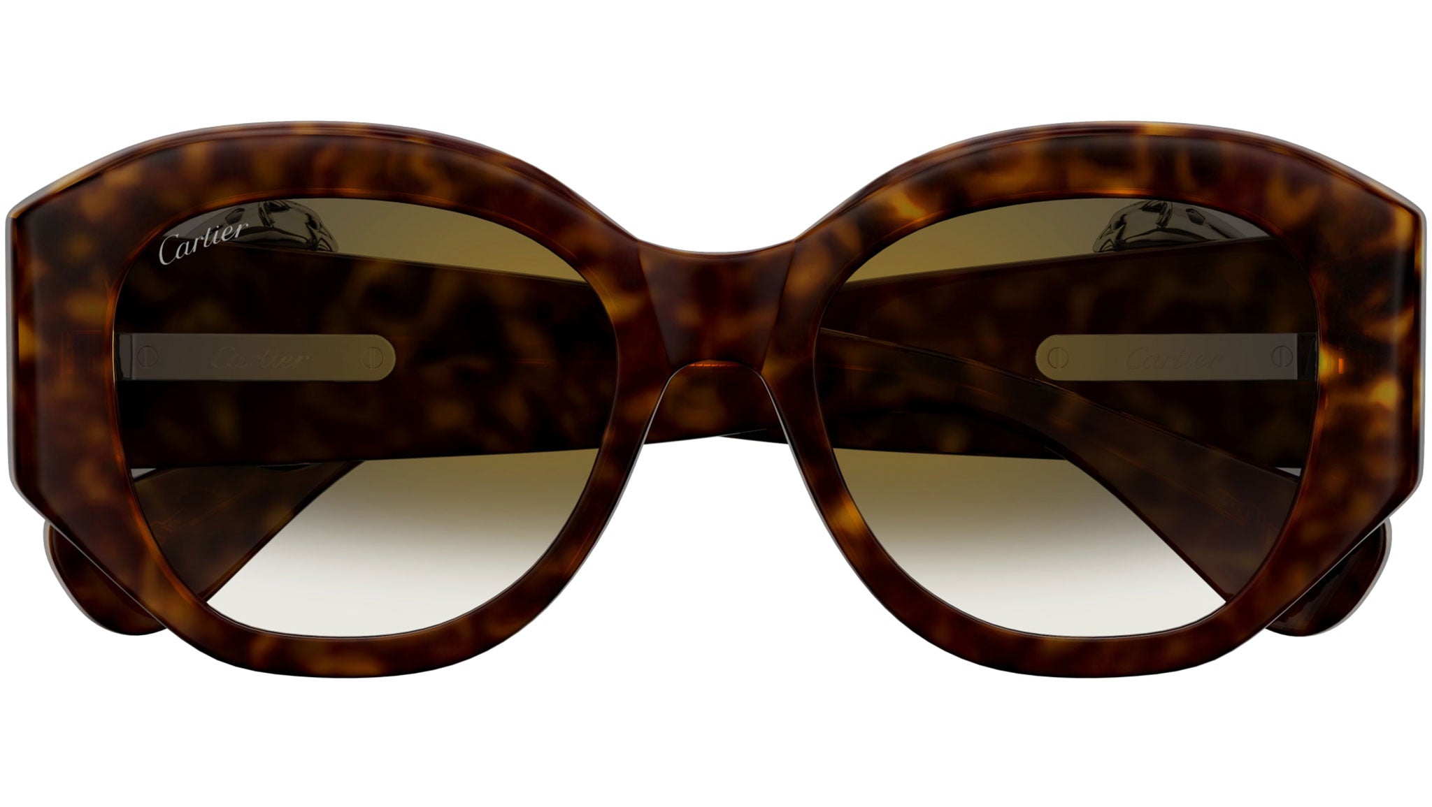 Occhiali da sole Cartier linea Core Range modello CT0502S in acetato riciclato a gatto codice colore 002 tartaruga scuro con aste color tartaruga e lenti color verde sfumato con flash dorato.