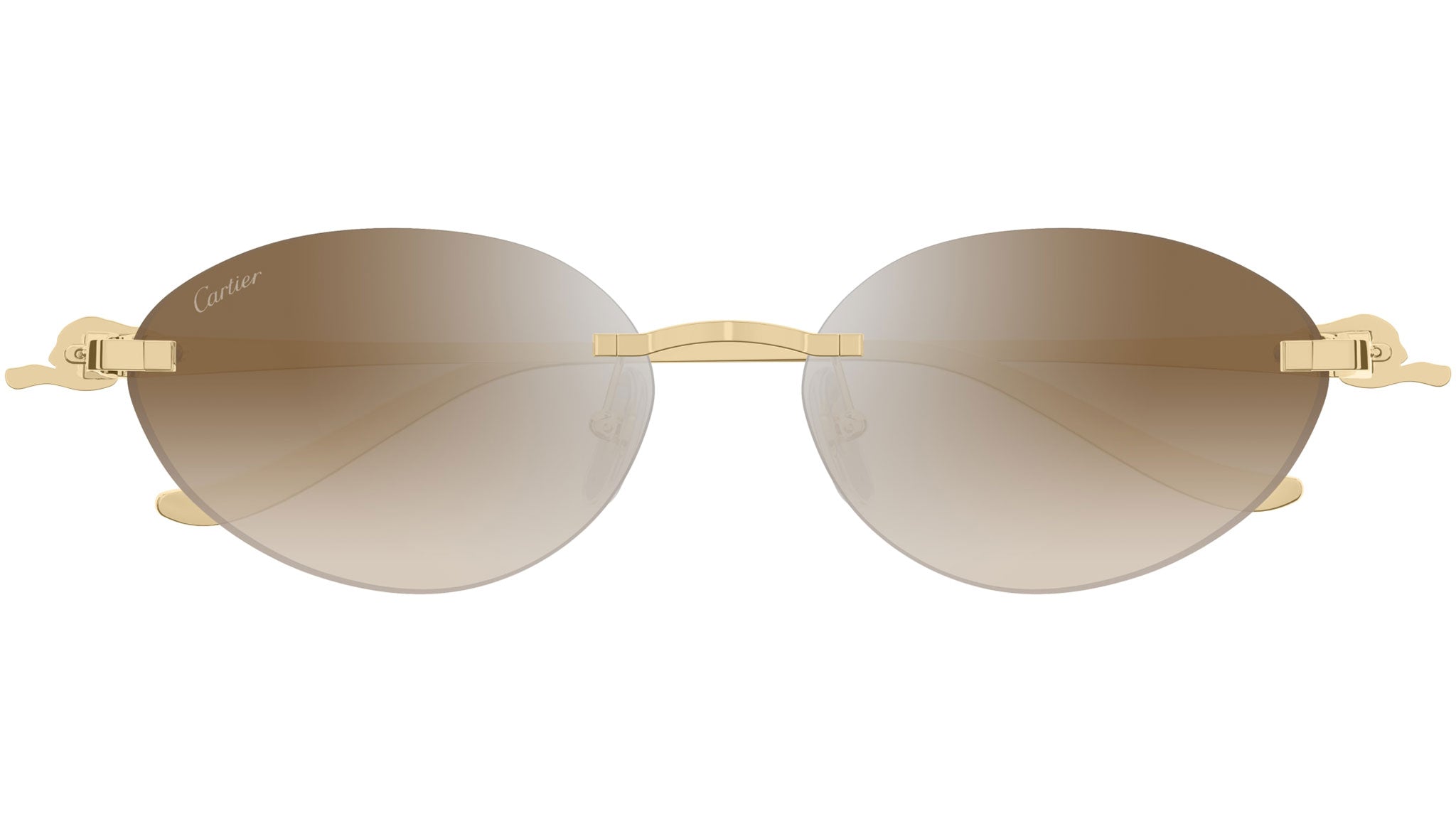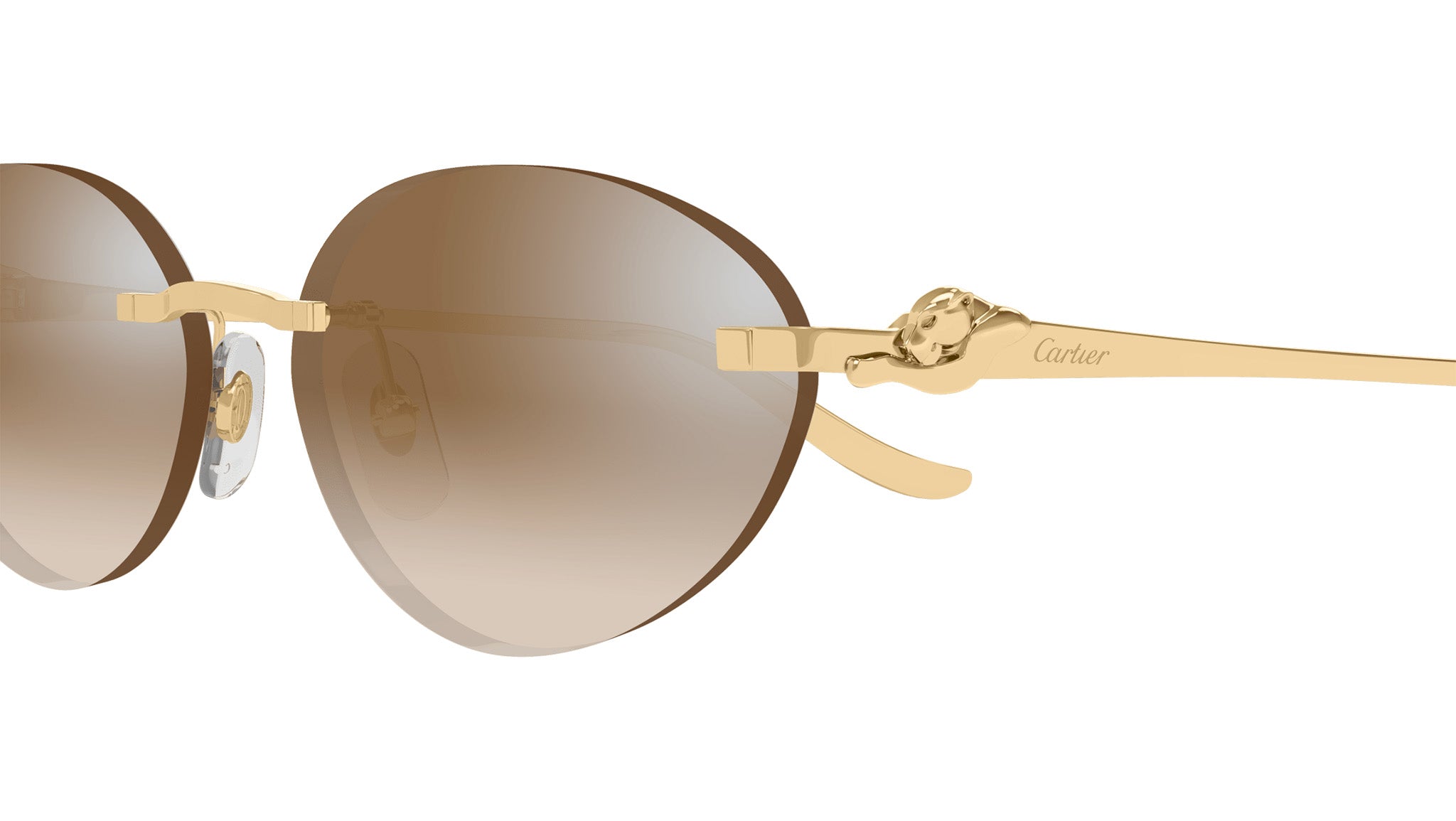 Occhiali da sole Cartier linea Core Range modello CT0504S in metallo a gatto codice colore 003 oro finitura smooth con aste color oro e lenti color marrone classificato con flash argento chiaro.