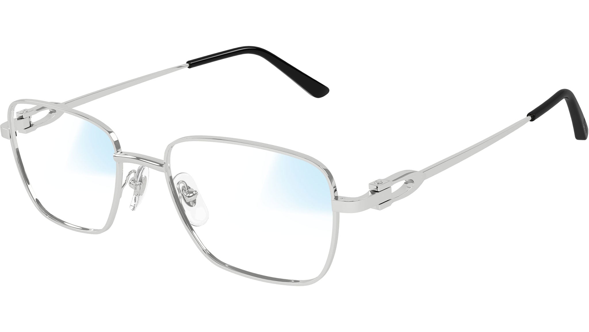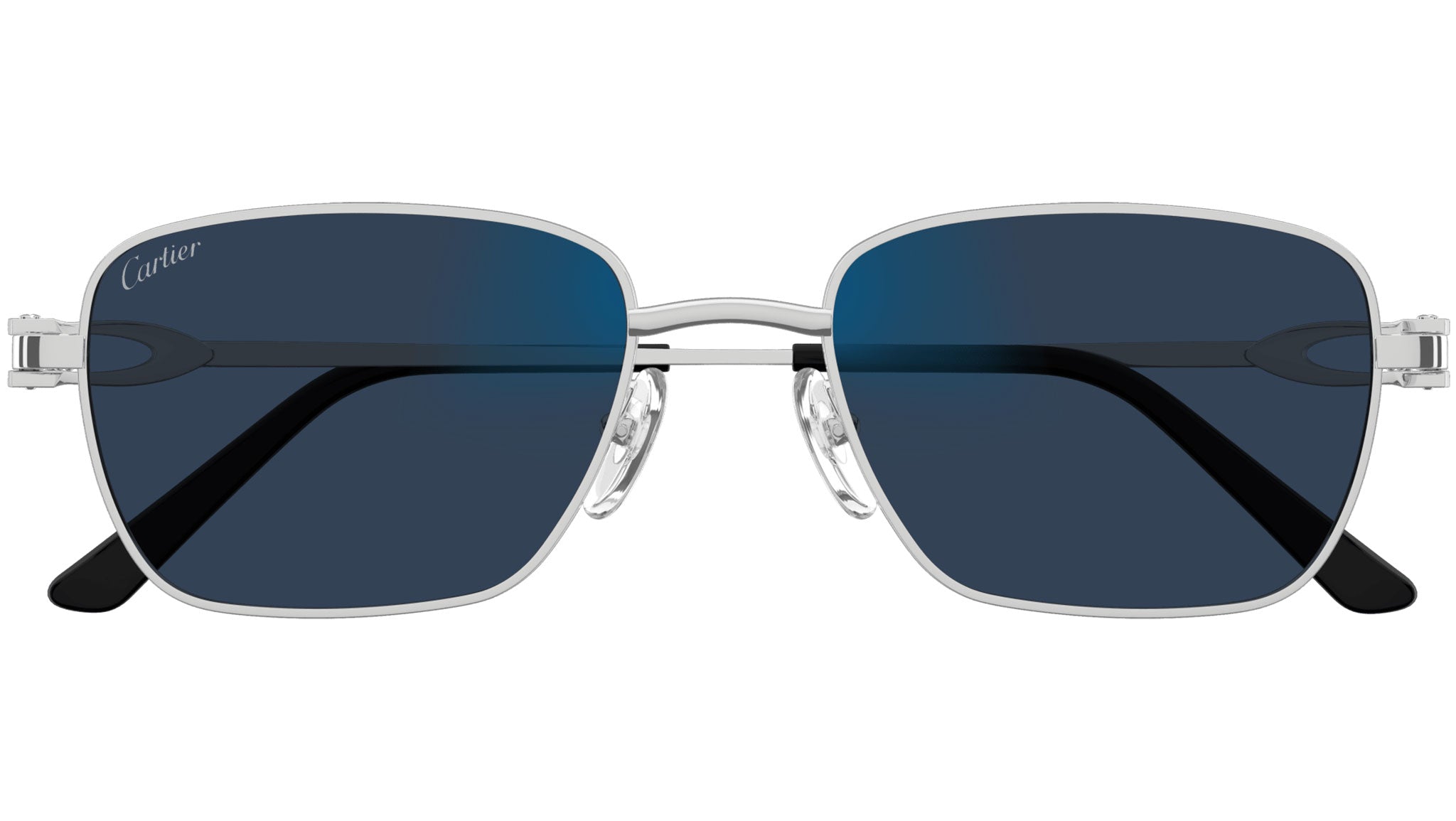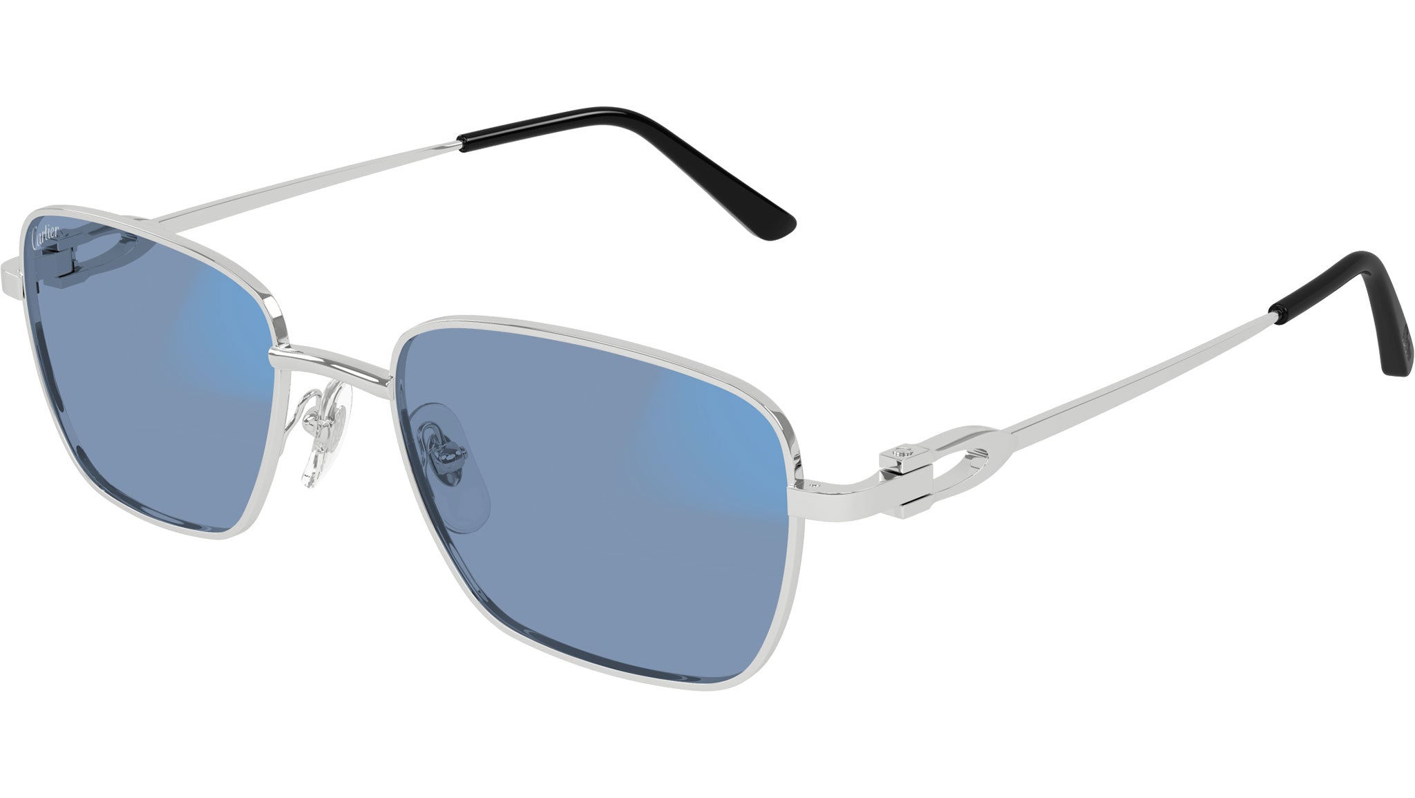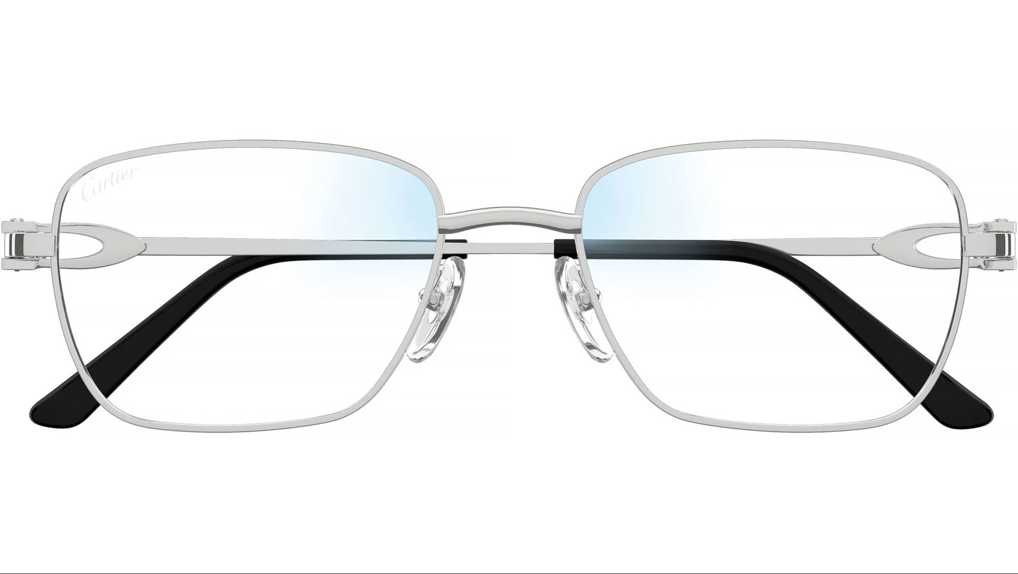 Occhiali da sole Cartier linea Core Range modello CT0519S in metallo rettangolare codice colore 001 finish platino levigato con aste color argento e lenti color demo con blu fotocromatico + filtro luce blu AR.