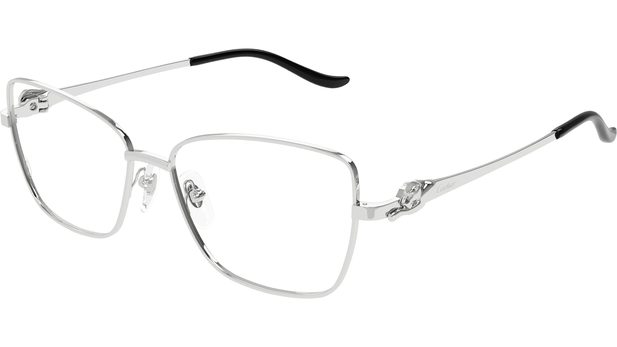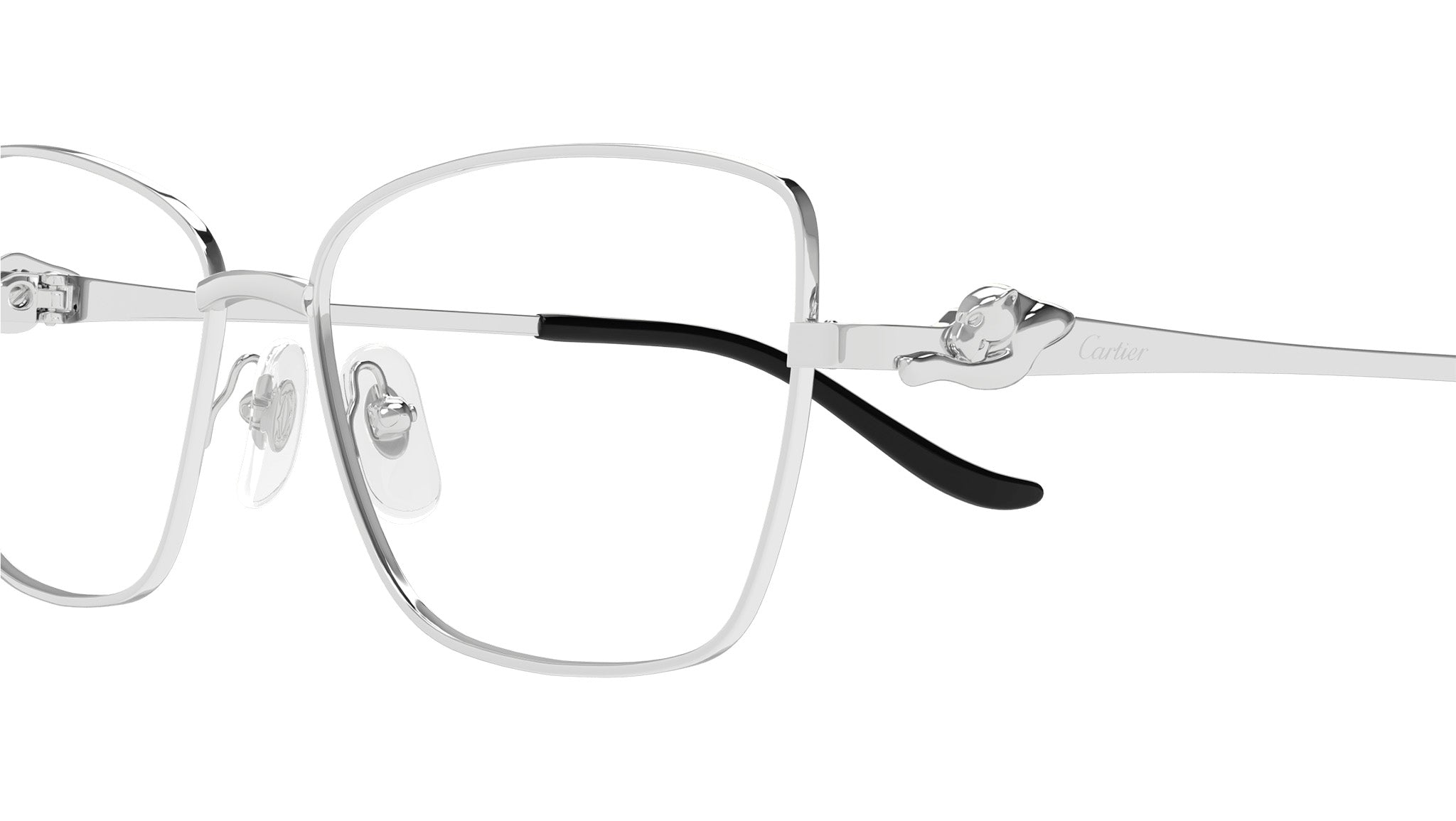 Occhiali da vista Cartier linea Core Range modello CT0523O in metallo a gatto codice colore 002 finish platino levigato con asta argento e lenti demo da materiale riciclato con strato HR e filtro AR blu.