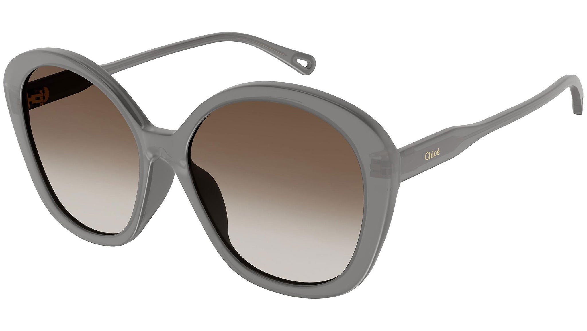 Occhiali da sole Chloé modello CH0081S 001, variante colore grigio opalino lucido con lenti color marrone sfumato.