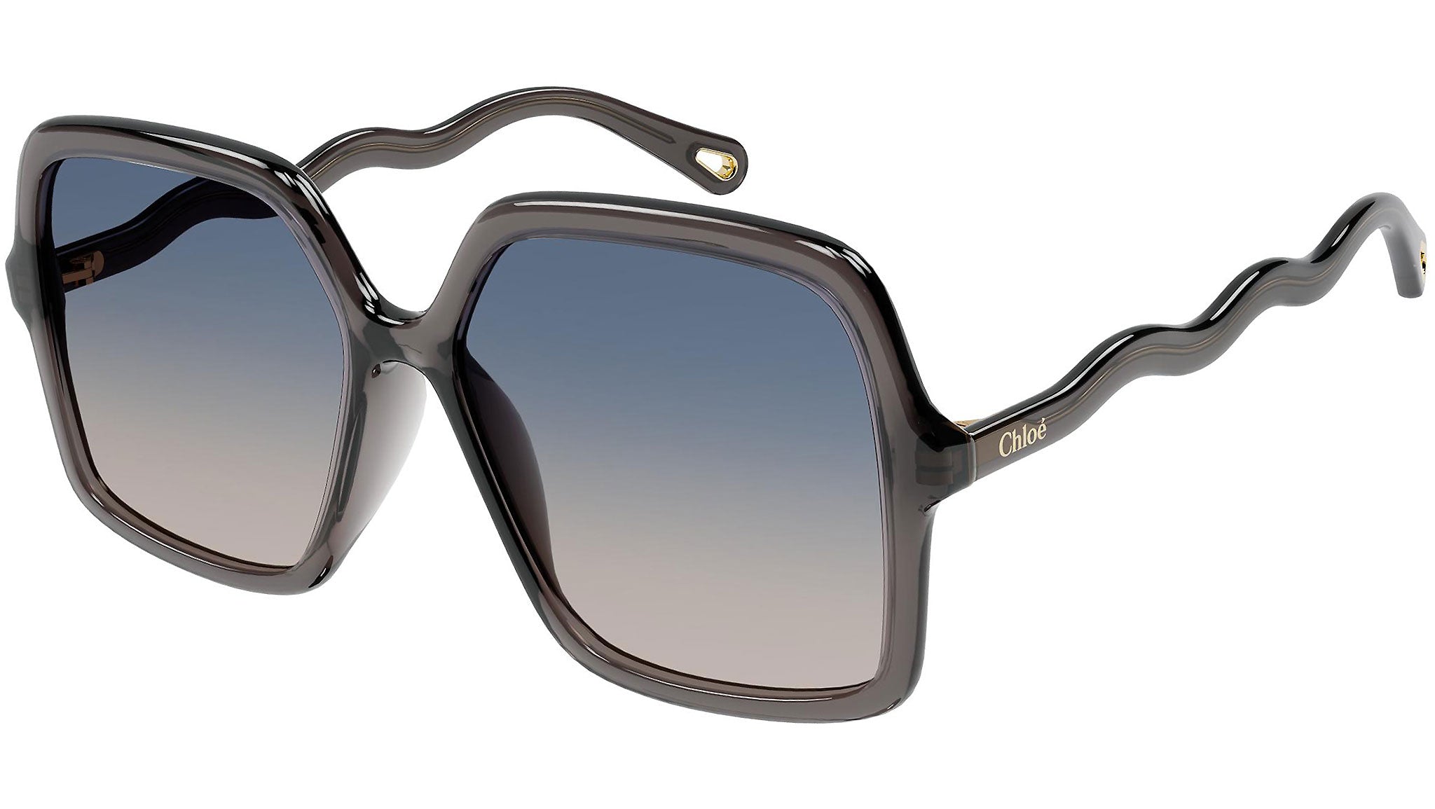 Occhiali da sole Chloé modello CH0086S 001, variante colore grigio trasparente lucido con lenti color doppia sfumatura blu e beige.