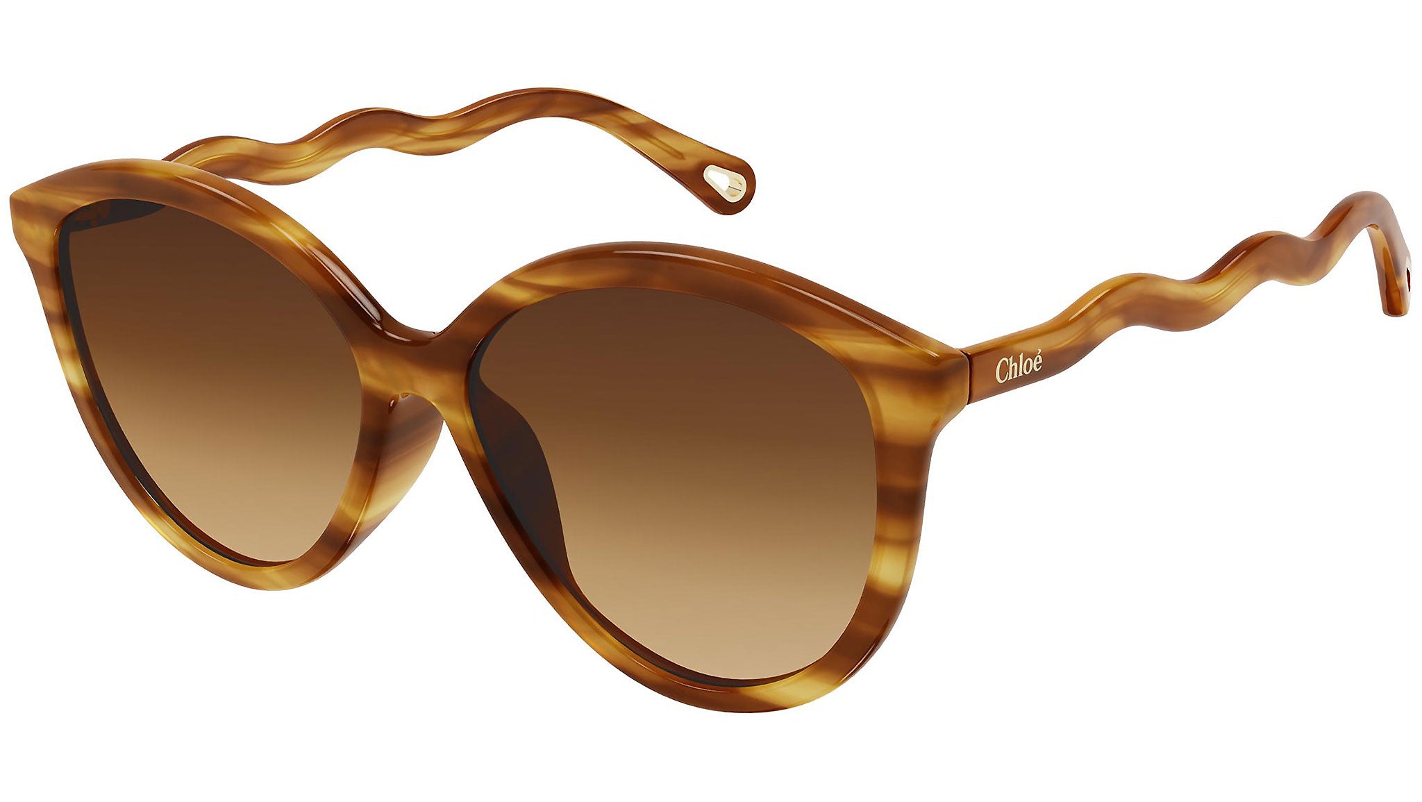 Occhiali da sole Chloé modello CH0087S 002, variante colore avana biondo lucido con lenti color doppia sfumatura marrone e arancione.