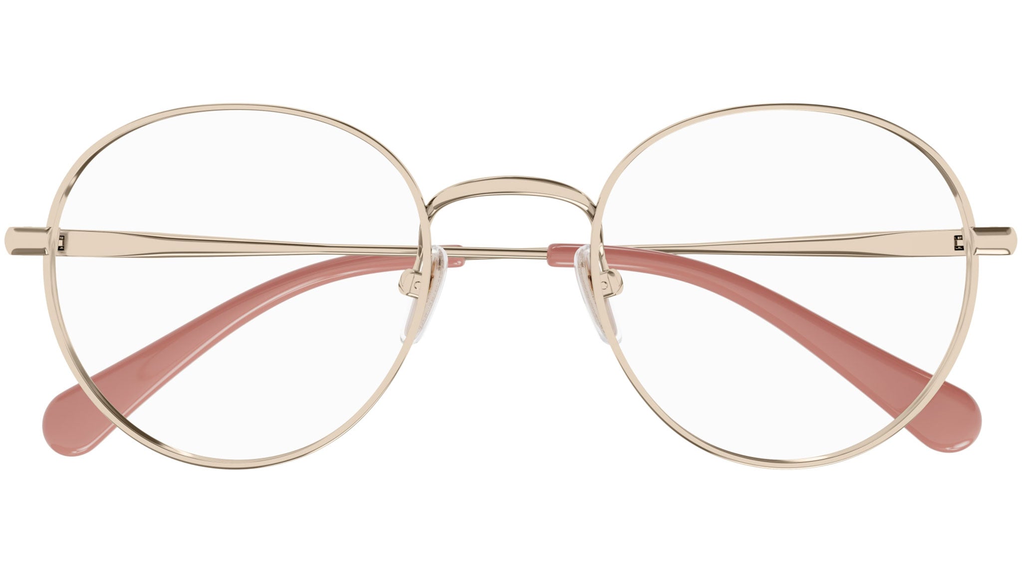 Occhiali da vista Chloé Kids modello CC0024O linea junior forma panto in metallo, codice colore 002 oro rosa lucido con aste color oro e lenti demo.