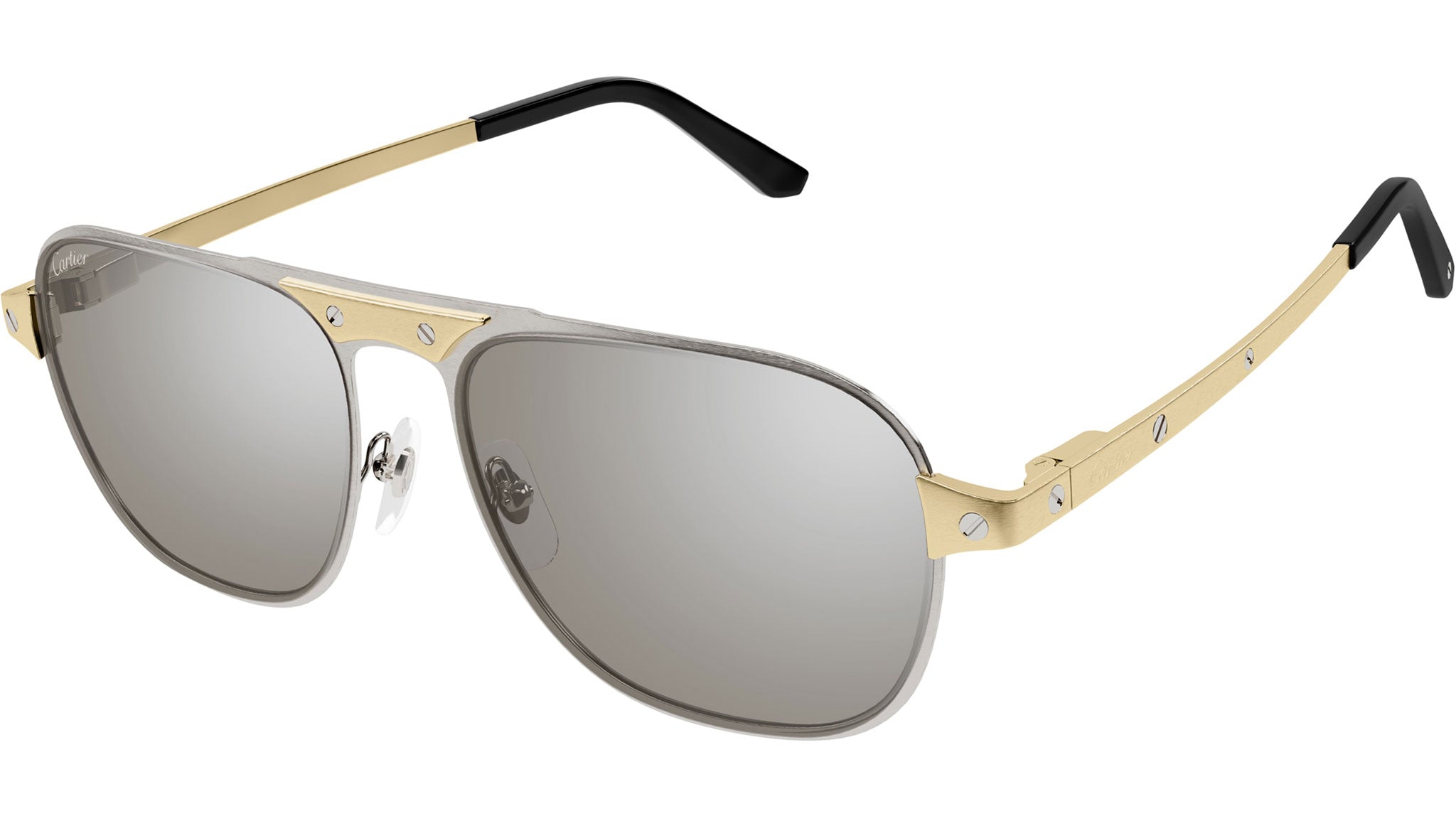 Occhiali da sole Cartier CT0532S 005 uomo con montatura aviatore in metallo argento e lenti grigio medio a specchio argento. Linea: Exception. Codice modello: CT0532S. Codice colore: 005. Made in France. Rivenditore autorizzato Cartier online. Gli occhiali vengono consegnati con custodia e accessori originali e sono coperti dalla garanzia ufficiale di 12 mesi del produttore.