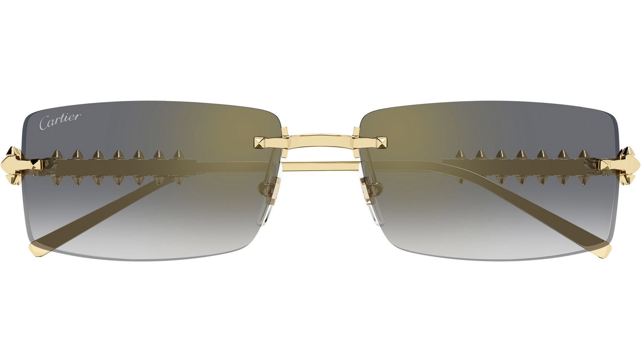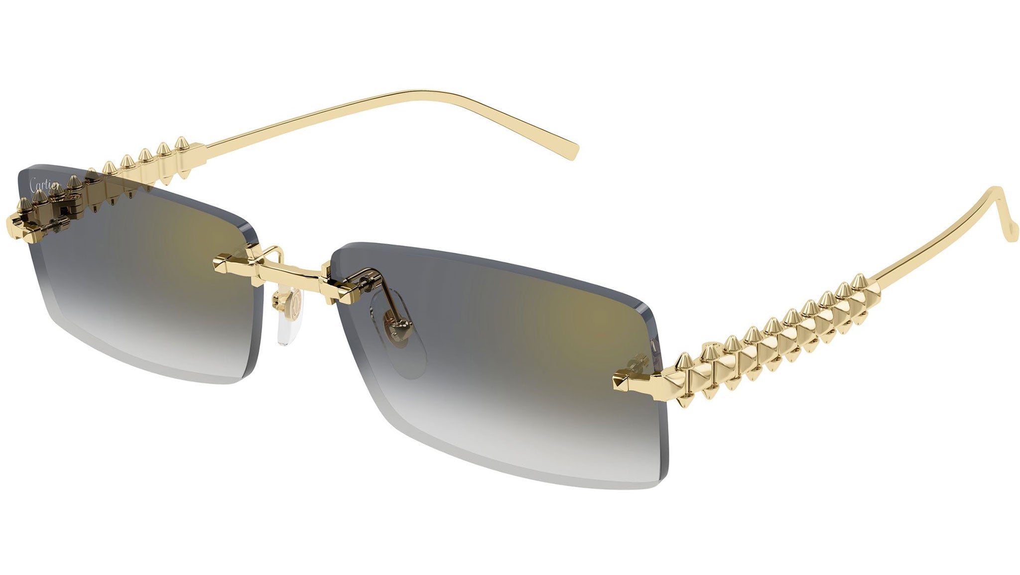Occhiali da sole Cartier CT0604S 001 unisex con montatura rettangolare in metallo color oro finitura smooth e lenti grigio sfumato con flash dorato. Linea: Exception. Codice modello: CT0604S. Codice colore: 001. Made in France. Rivenditore autorizzato Cartier online. Gli occhiali vengono consegnati con custodia e accessori originali e sono coperti dalla garanzia ufficiale di 12 mesi del produttore.
