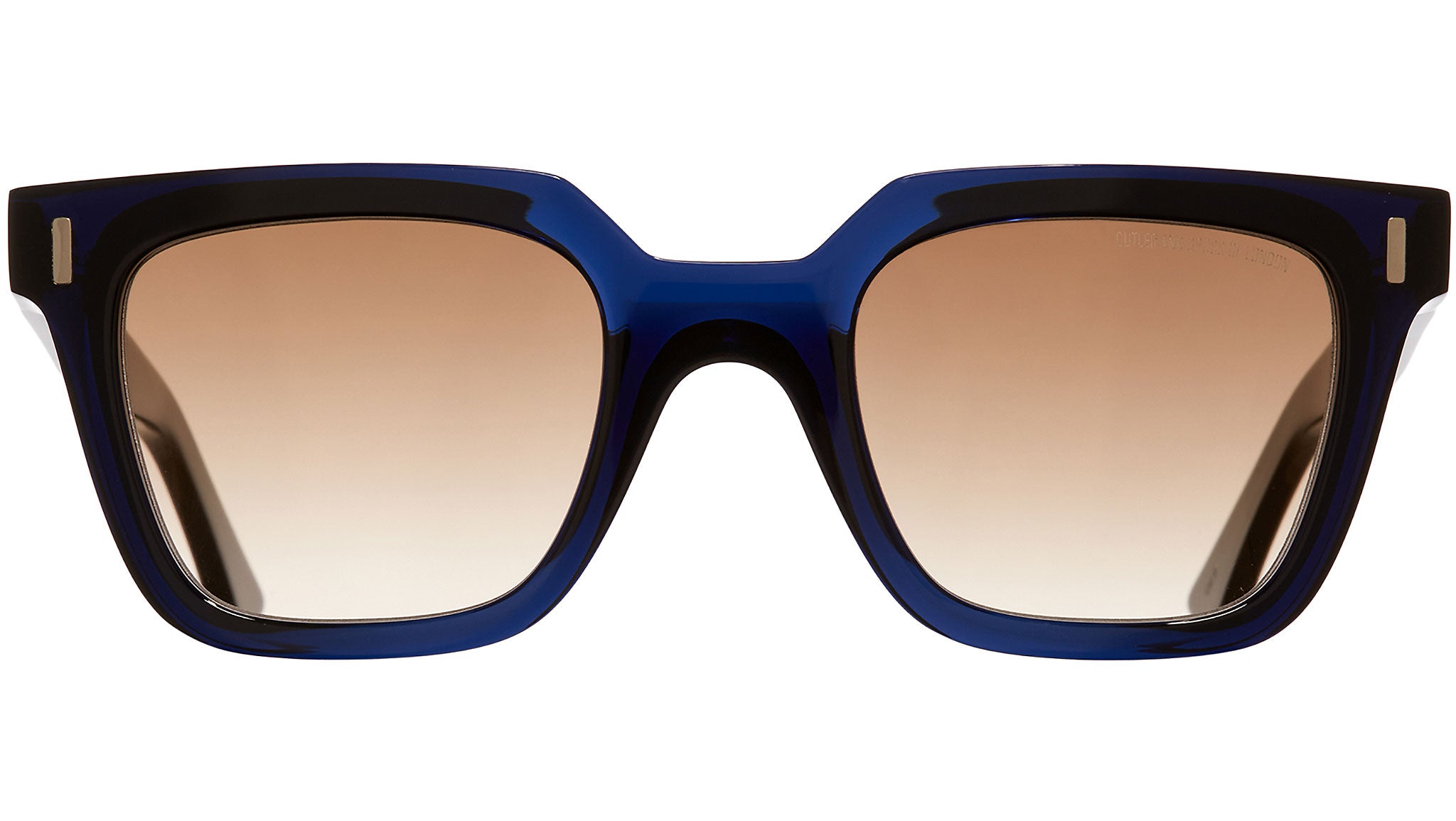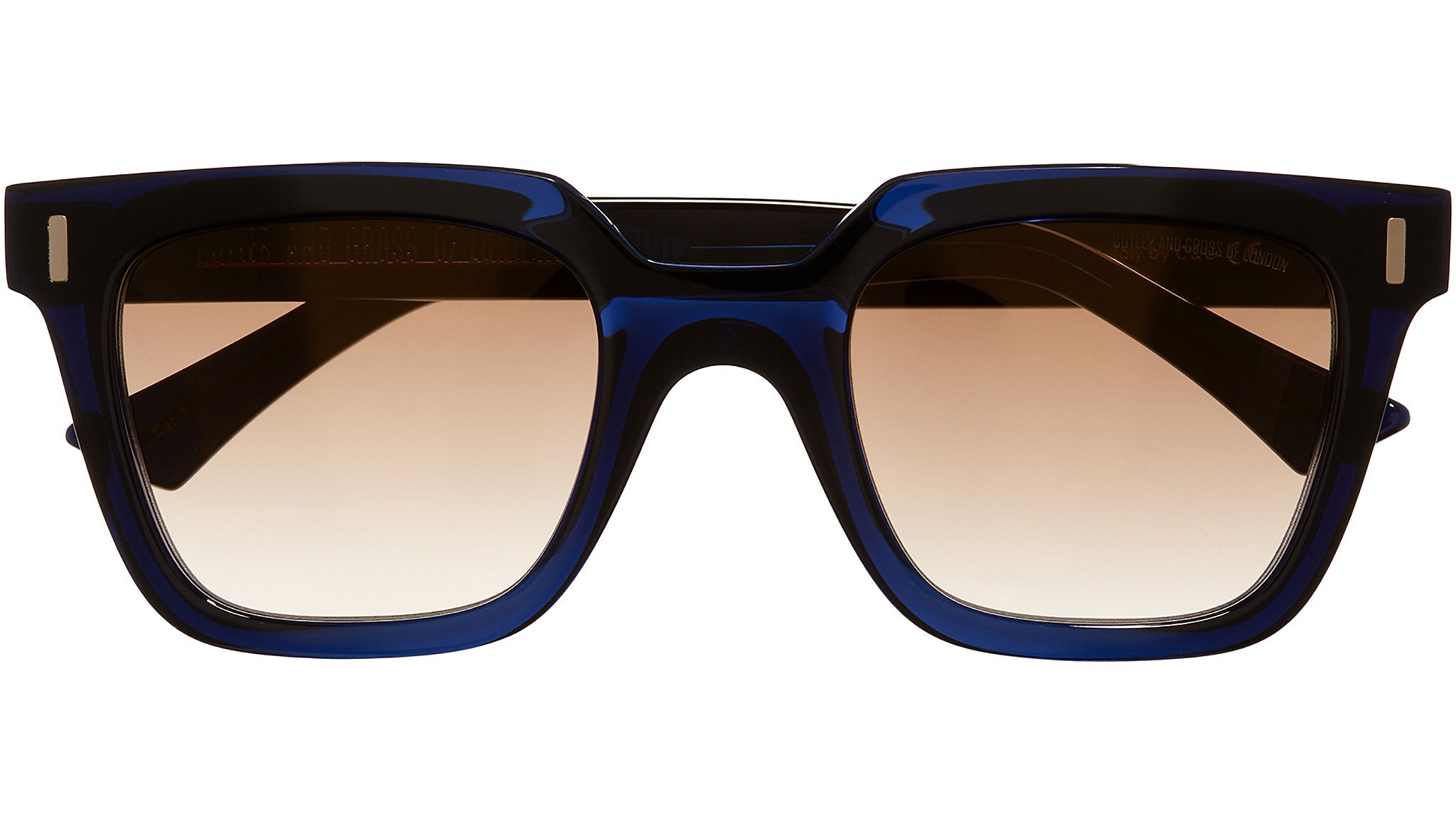 Large square designer pair of sunglasses with interior 'televisioni' milling from 9mm sheet acetate milled from behind for comfort. Flat bridge a new vertical frontal pin and pinless temples.