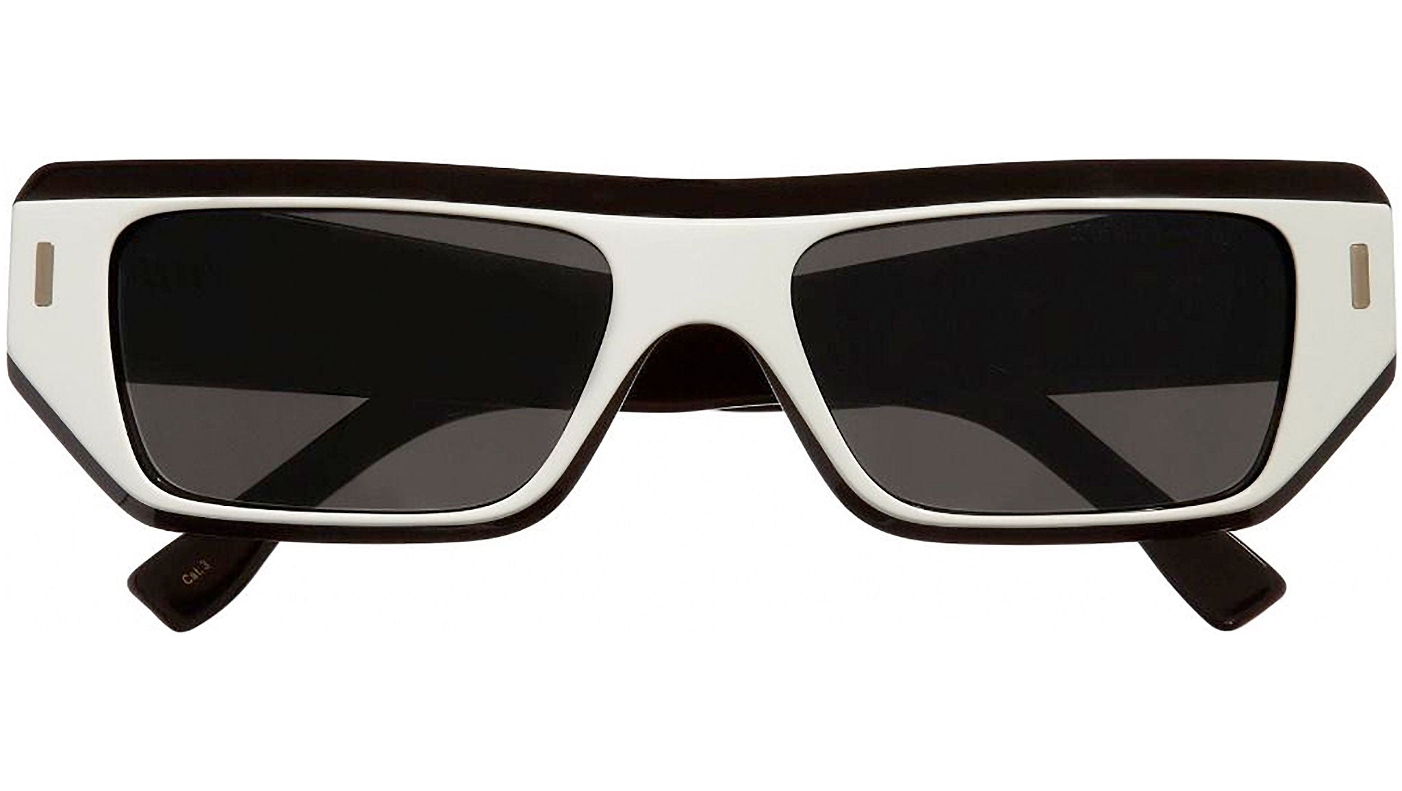 A new generation slice frame with a striking regressive matte milled browline and wide temples. Polished acetate primary frontal with matte acetate base and temples. Vertical flush pins.