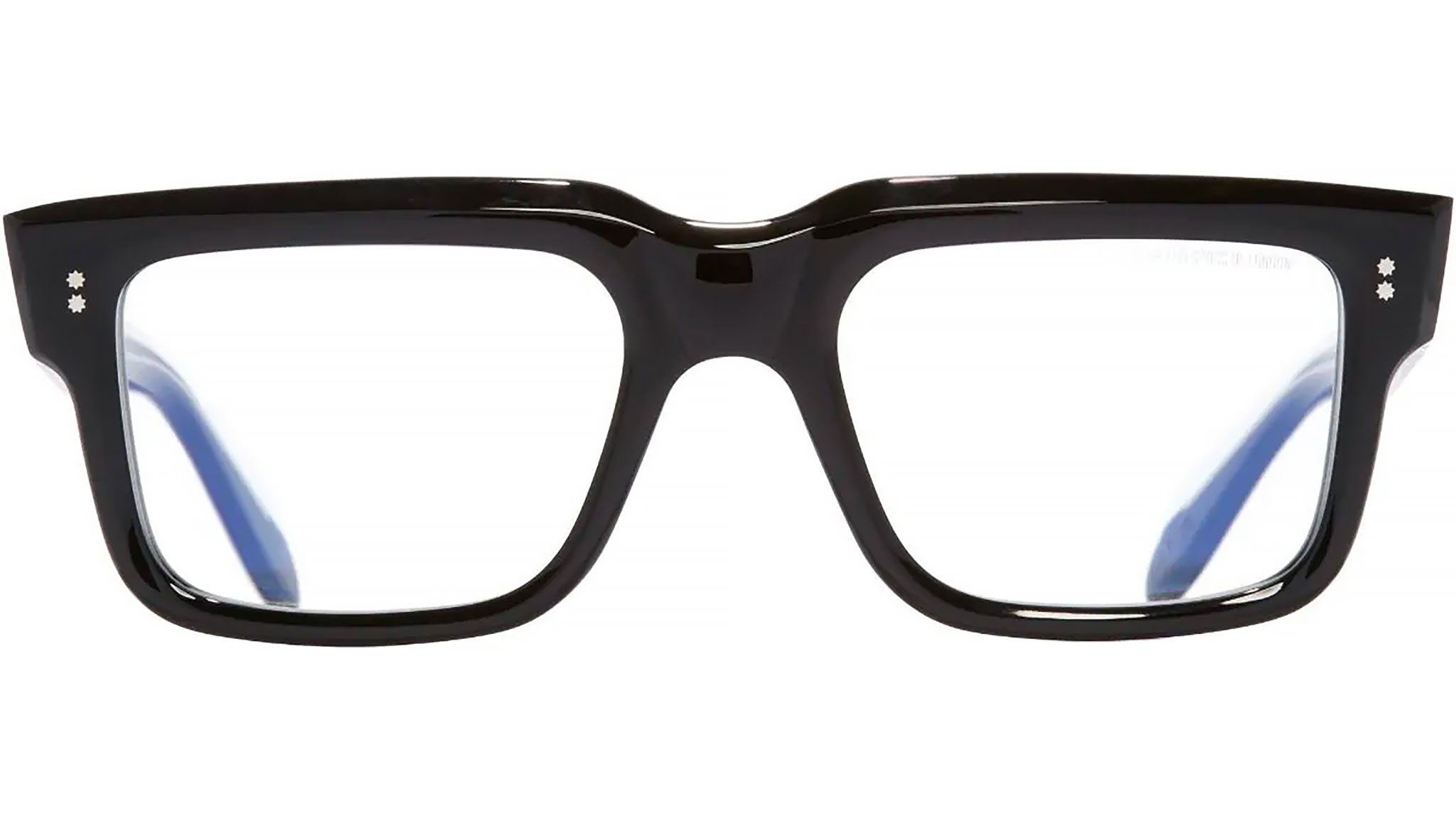 La montatura da vista 1403 nera è realizzata da un'unica lastra di acetato con una precisione senza precedenti. È smussato con il ponte nasale rovesciato per rendere più leggera la montatura e rivestito con aste a doppio strato che offrono scorci di cristallo a certe angolazioni. I perni sono lucidati a forma di stella di bussola che aggiungono il prestigio di Cutler and Gross.