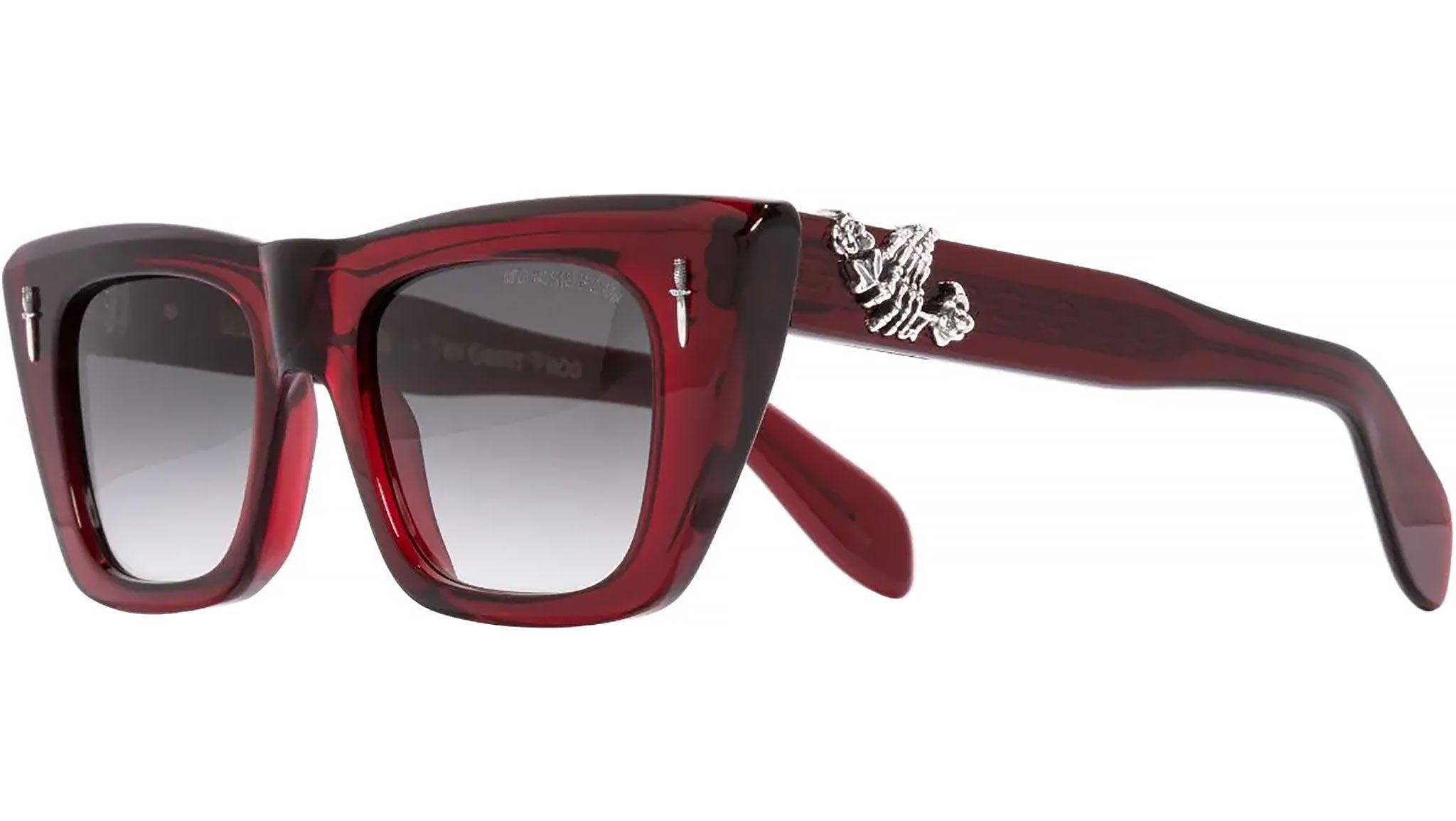 Ispirato all'iconografia anarchica di The Great Frog, questa montatura unica presenta un dettaglio di rilievo, una mano scheletrica che stringe una rosa che abbellisce all'asta donandogli un aspetto unico e inequivocabile . Prodotto artigianalmente, il design presenta una silhouette cat-eye e una linea di sopracciglia retta. Il frontale è ornato da due pugnali affilati in argento Sterling, mentre la catena Lock Down ridefinisce la struttura alle aste. Una fusione di ribellione e raffinatezza, questo occhiale è un'ode all'individualità e allo stile distintivo.