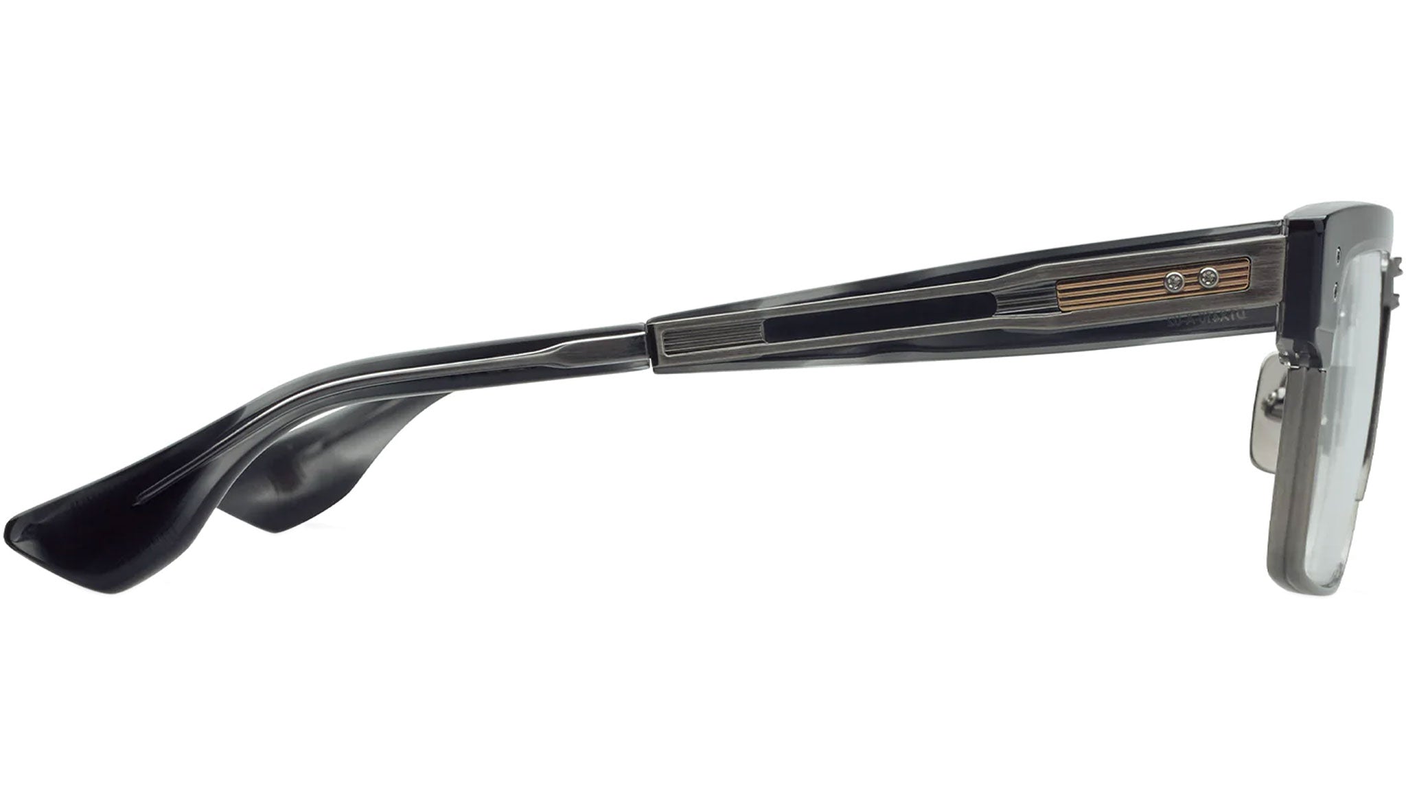 The unique side construction, inspired by the Wasserman, features a three-layer temple that combines premium acetate, titanium wire core, and exoskeleton. A sum greater than its parts, the Hackatron perfectly balances weight, strength, and aesthetic beauty.