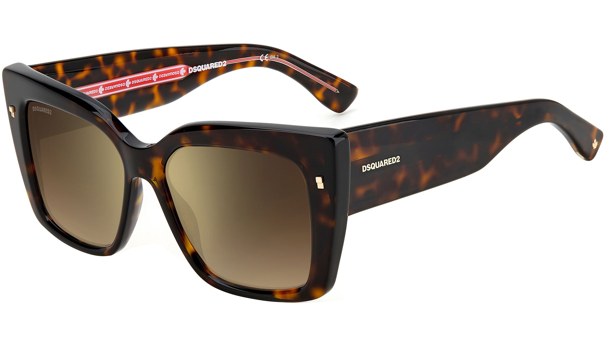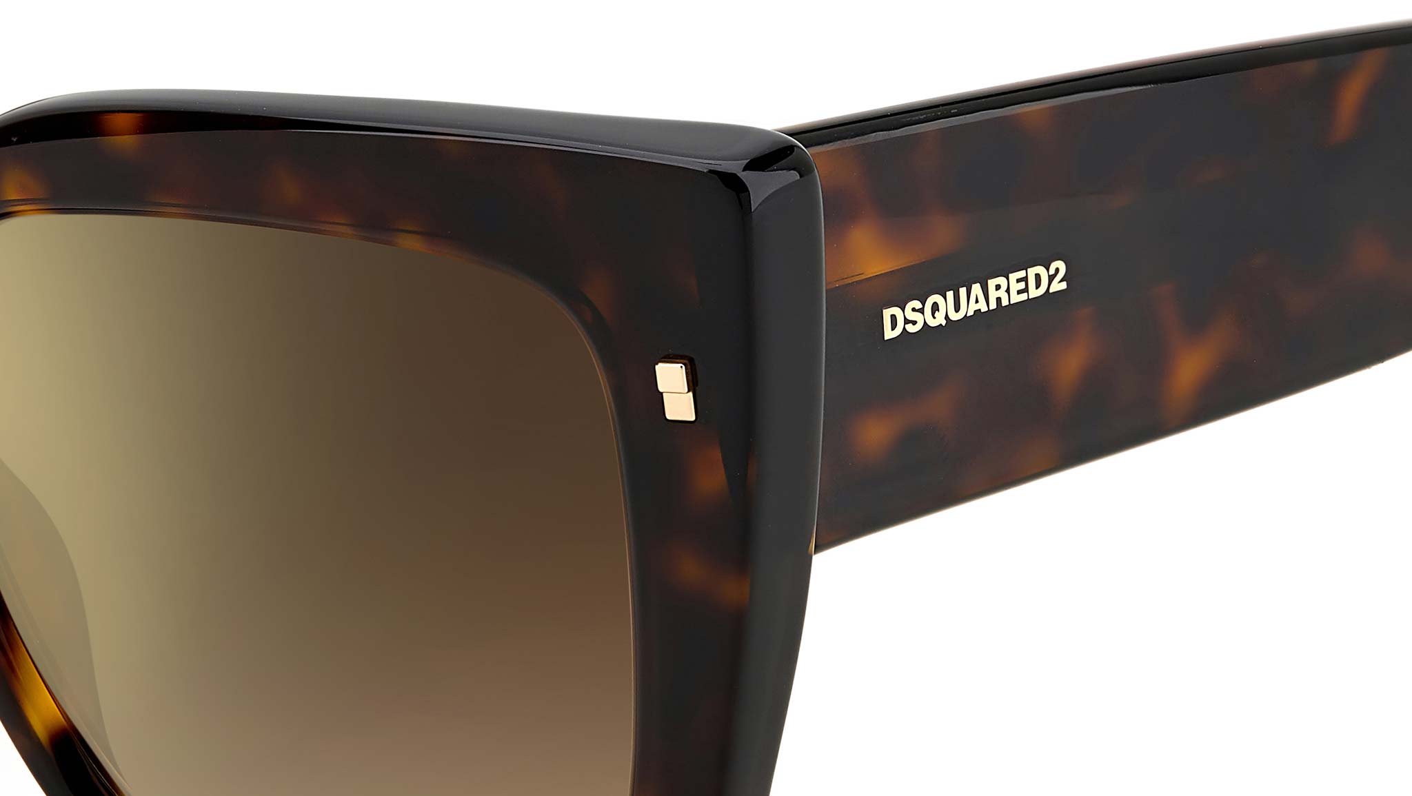 Sono occhiali da sole dall’anima vintage, ma senza tempo: la montatura dalle particolari sagome è firmata dal logo DSQUARED2 in rosso e bianco sull’anima metallica delle aste, ispirato alle caratteristiche etichette dell’abbigliamento. Gli iconici rivetti in metallo sul frontale acetato e la foglia d’acero nei terminali sono l’emblema di questi occhiali da donna, creati nello stile inimitabile e inconfondibile DSQUARED2.