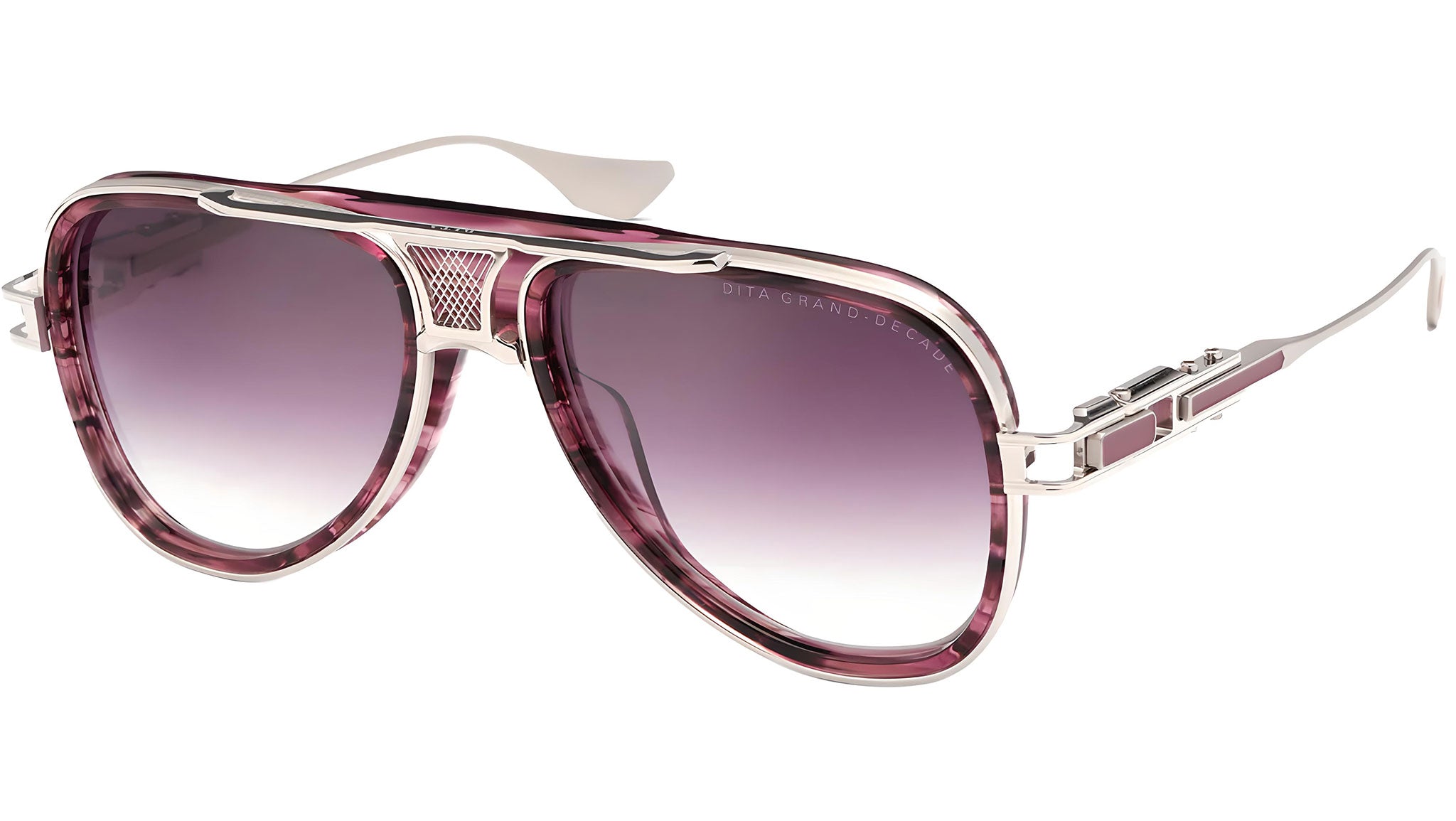 Occhiali da sole Dita Grand-Decade DTS460 04 unisex con montatura aviatore in acetato-titanio viola striato e lenti demo. Codice modello: DTS460. Codice colore: 04. Rivenditore autorizzato Dita online. Gli occhiali vengono consegnati con custodia e accessori originali e sono coperti dalla garanzia ufficiale di 12 mesi del produttore.