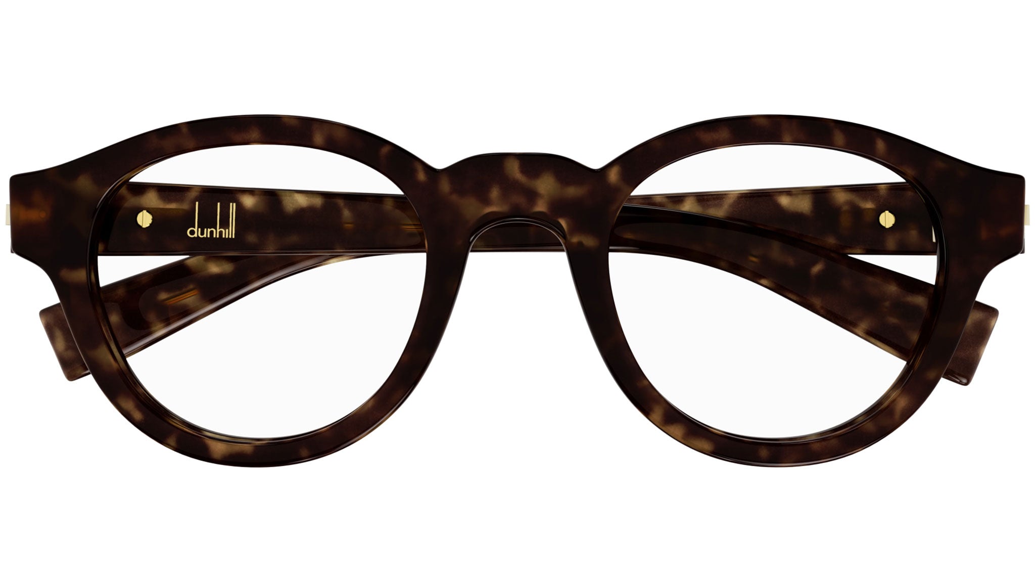Occhiali da vista Dunhill modello DU0089O linea Eyewear forma panto in acetato riciclato, codice colore 002 tartaruga scuro lucido con aste color tartaruga e lenti demo.
