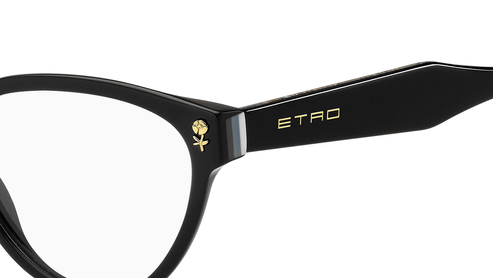 Occhiali da vista ETRO modello 0014 codice colore 807 nero con lenti demo Un omaggio ai motivi floreali e pattern grafici che definiscono l'estetica di ETRO, la collezione eyewear "Graphic Elegance" traduce i ricami e le stampe della Maison in occhiali da vista eclettici e raffinati. La montatura in acetato dagli angoli smussati è impreziosita da un'applicazione in metallo a forma di fiore e un inserto a righe multicolore sui lati. Le aste sono realizzate in acetato trasparente con un'anima interna in metallo. Il design innovativo è completato dagli iconici terminali in acetato, ispirati alla simmetria del logo ETRO. Rivenditore autorizzato online ETRO Eyewear.
