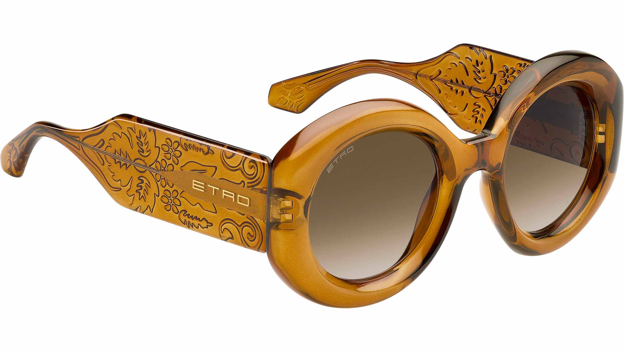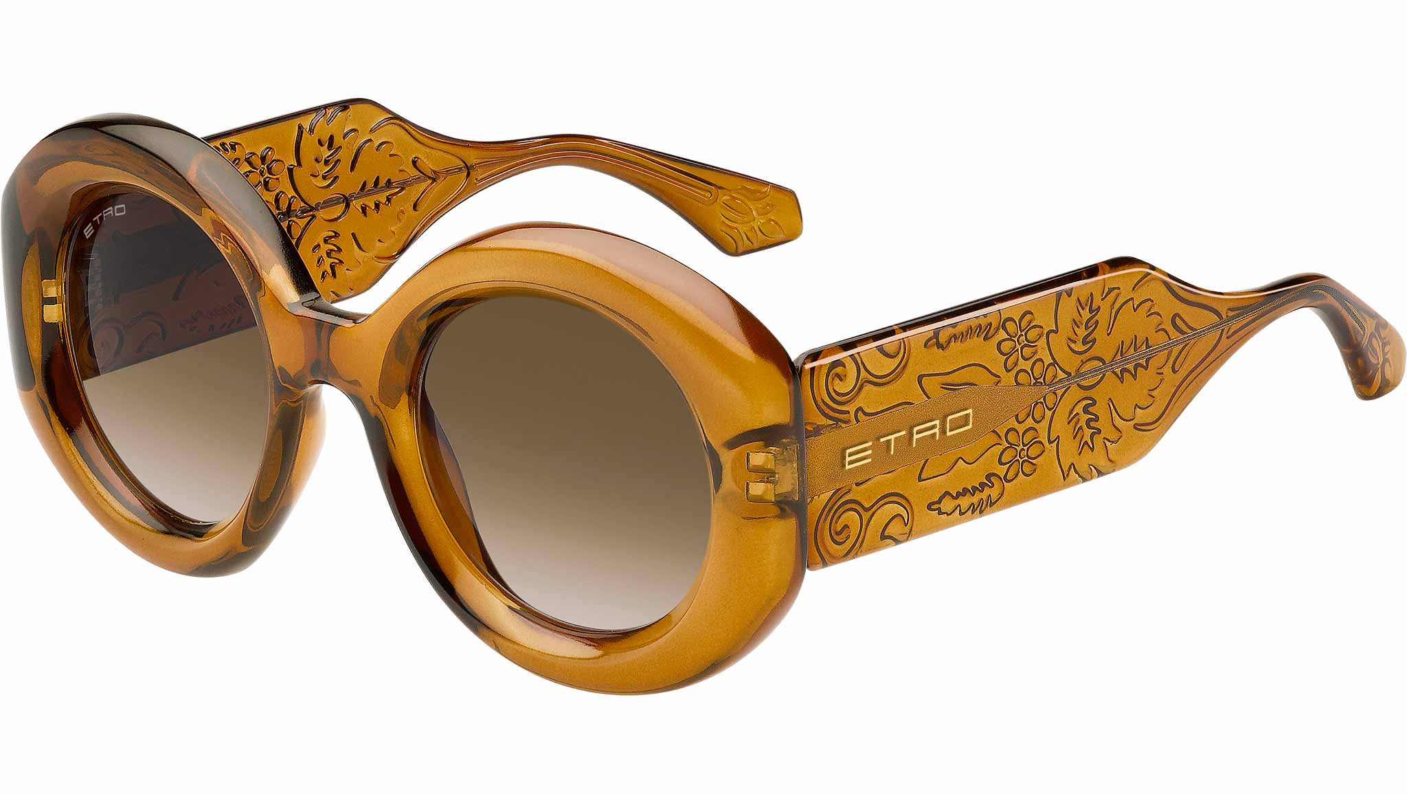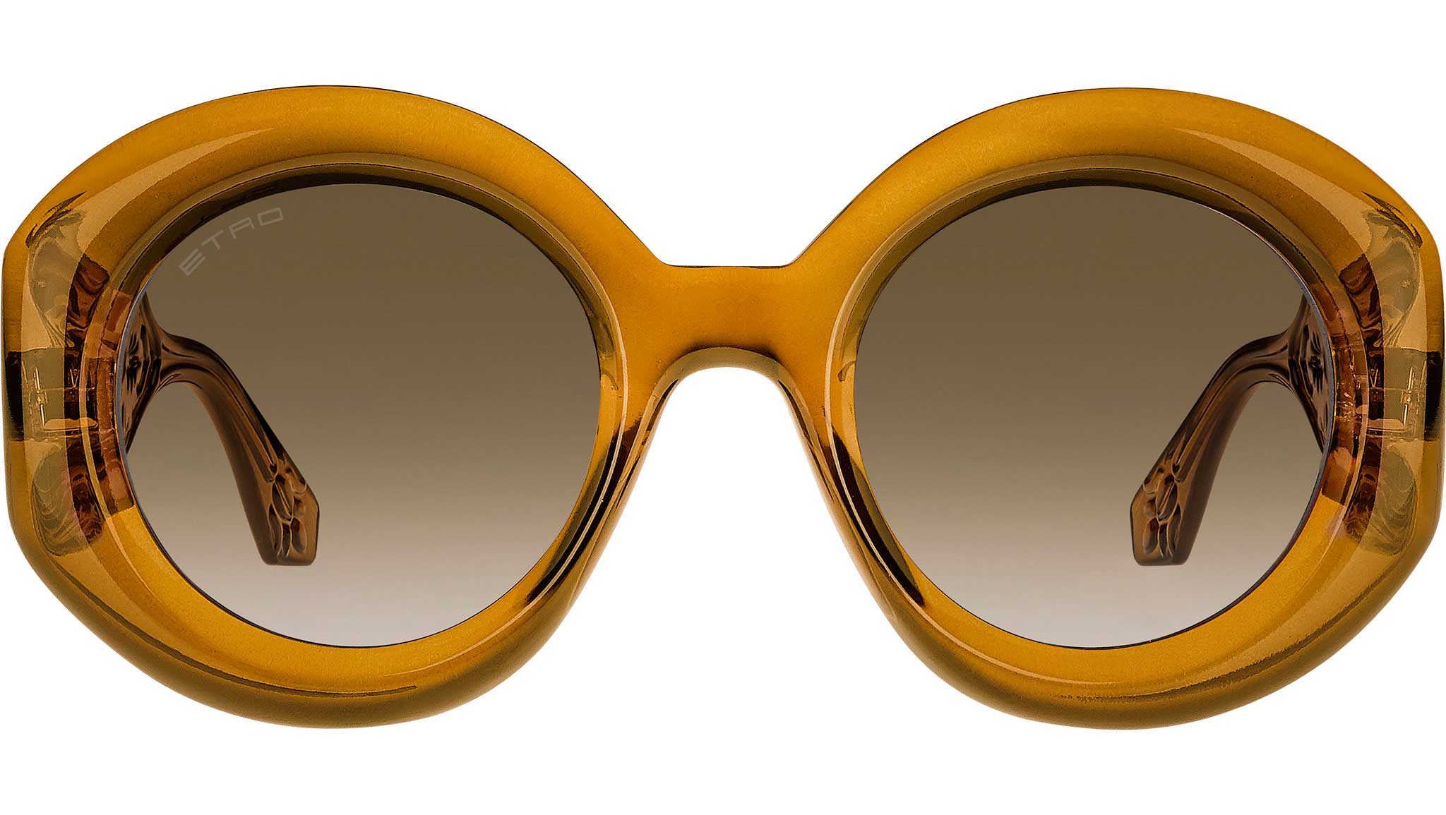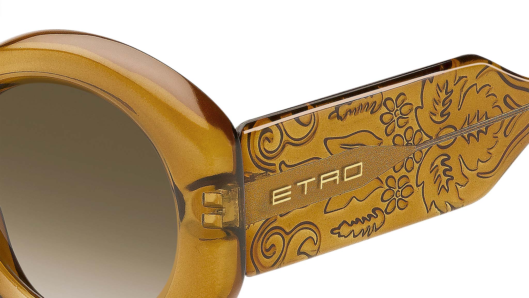 Occhiali da sole ETRO modello 0016/G/S codice colore ETV HA in Injected ambra oro con lenti in CR-39 marrone sfumato. La collezione eyewear "Paisley" di ETRO richiama il codice stilistico più amato della Maison milanese: il motivo cashmere. Conosciuta per i suoi tessuti pregiati, ETRO ha reinterpretato questa grafica tradizionale in un'infinita varietà di espressioni e cromie. Questi occhiali da sole hanno un design leggero e confortevole, caratterizzato dall motivo paisley inciso all'interno delle aste e visibile in trasparenza. La montatura è completata da terminali iconici, lettering ETRO inciso sulle lenti e asta interna in metallo con logo color oro per un tocco prezioso. Rivenditore autorizzato online Dsquared2.