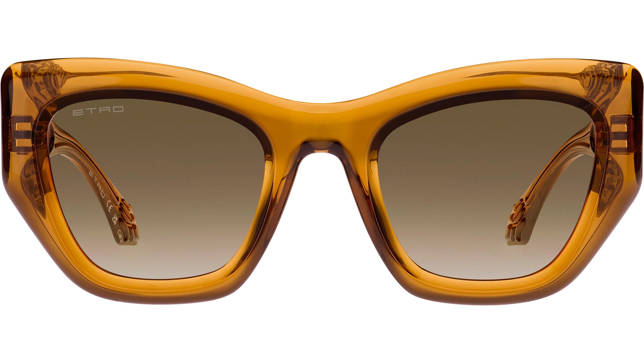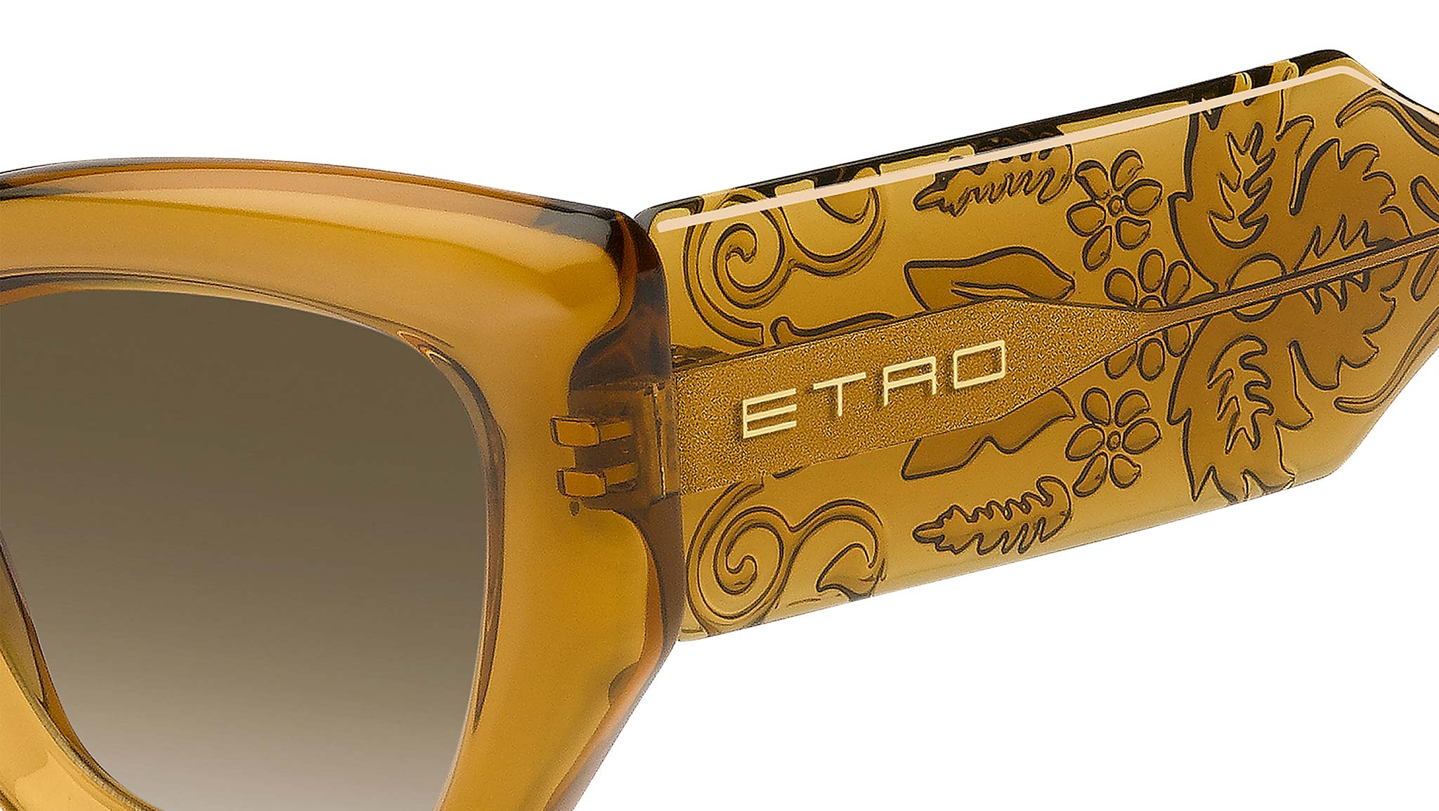 Occhiali da sole ETRO modello 0017/S codice colore ETV HA in Injected ambra oro con lenti in CR-39 marrone sfumato. La collezione eyewear "Paisley" di ETRO richiama il codice stilistico più amato della Maison milanese: il motivo cashmere. Conosciuta per i suoi tessuti pregiati, ETRO ha reinterpretato questa grafica tradizionale in un'infinita varietà di espressioni e cromie. Questi occhiali da sole hanno un design leggero e confortevole, caratterizzato dall motivo paisley inciso all'interno delle aste e visibile in trasparenza. La montatura è completata da terminali iconici, lettering ETRO inciso sulle lenti e asta interna in metallo con logo color oro per un tocco prezioso. Rivenditore autorizzato online Dsquared2.