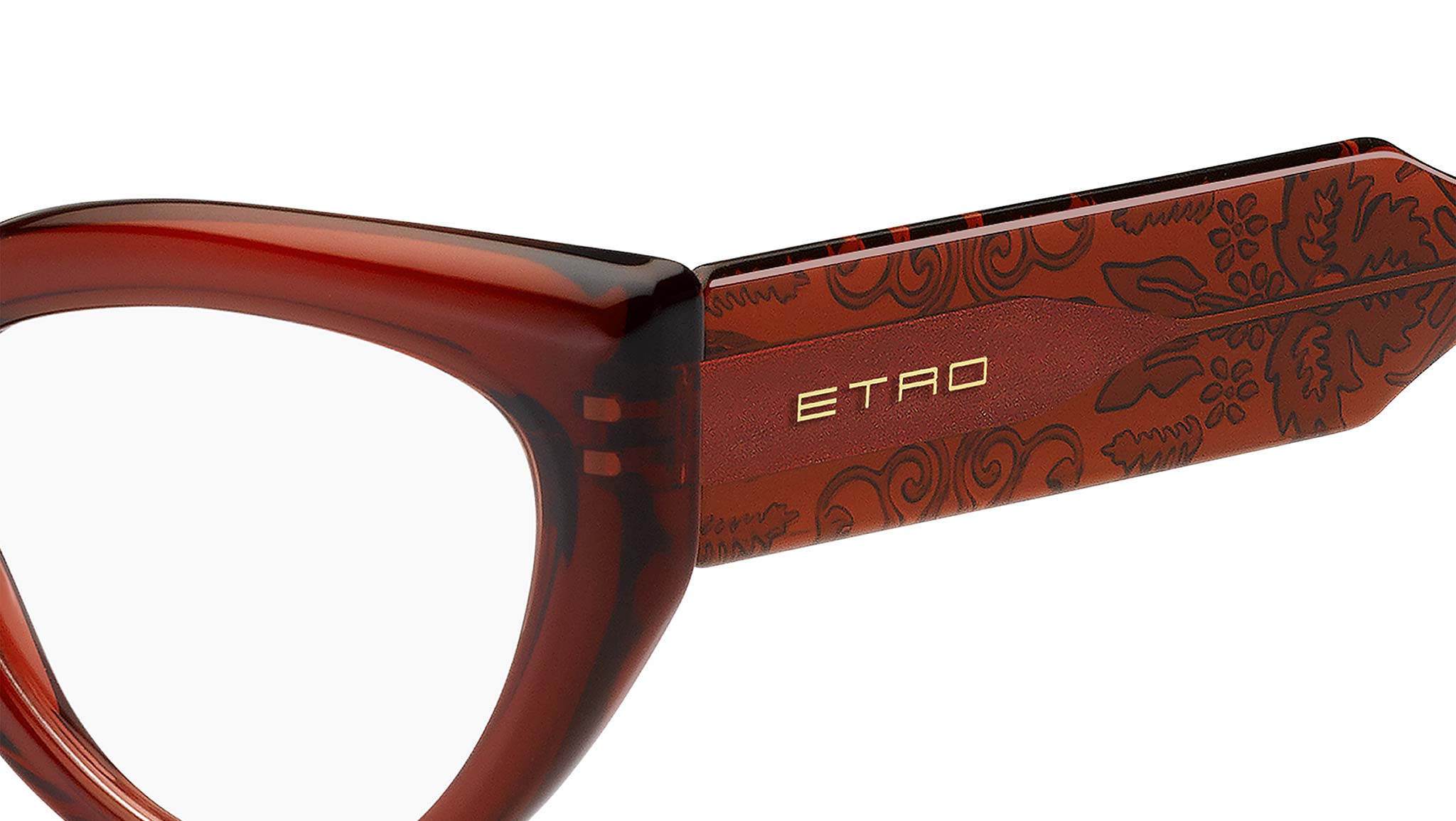 Occhiali da vista ETRO modello 0018 codice colore 2LF mattone con lenti demo La collezione eyewear "Paisley" di ETRO richiama il codice stilistico più amato della Maison milanese: il motivo cashmere. Conosciuta per i suoi tessuti pregiati, ETRO ha reinterpretato questa grafica tradizionale in un'infinita varietà di espressioni e cromie. Questi occhiali da vista hanno un design leggero e confortevole, caratterizzato dall motivo paisley inciso all'interno delle aste e visibile in trasparenza. La montatura è completata da terminali iconici, asta interna in metallo e il logo color oro per un tocco prezioso. Rivenditore autorizzato online ETRO Eyewear.