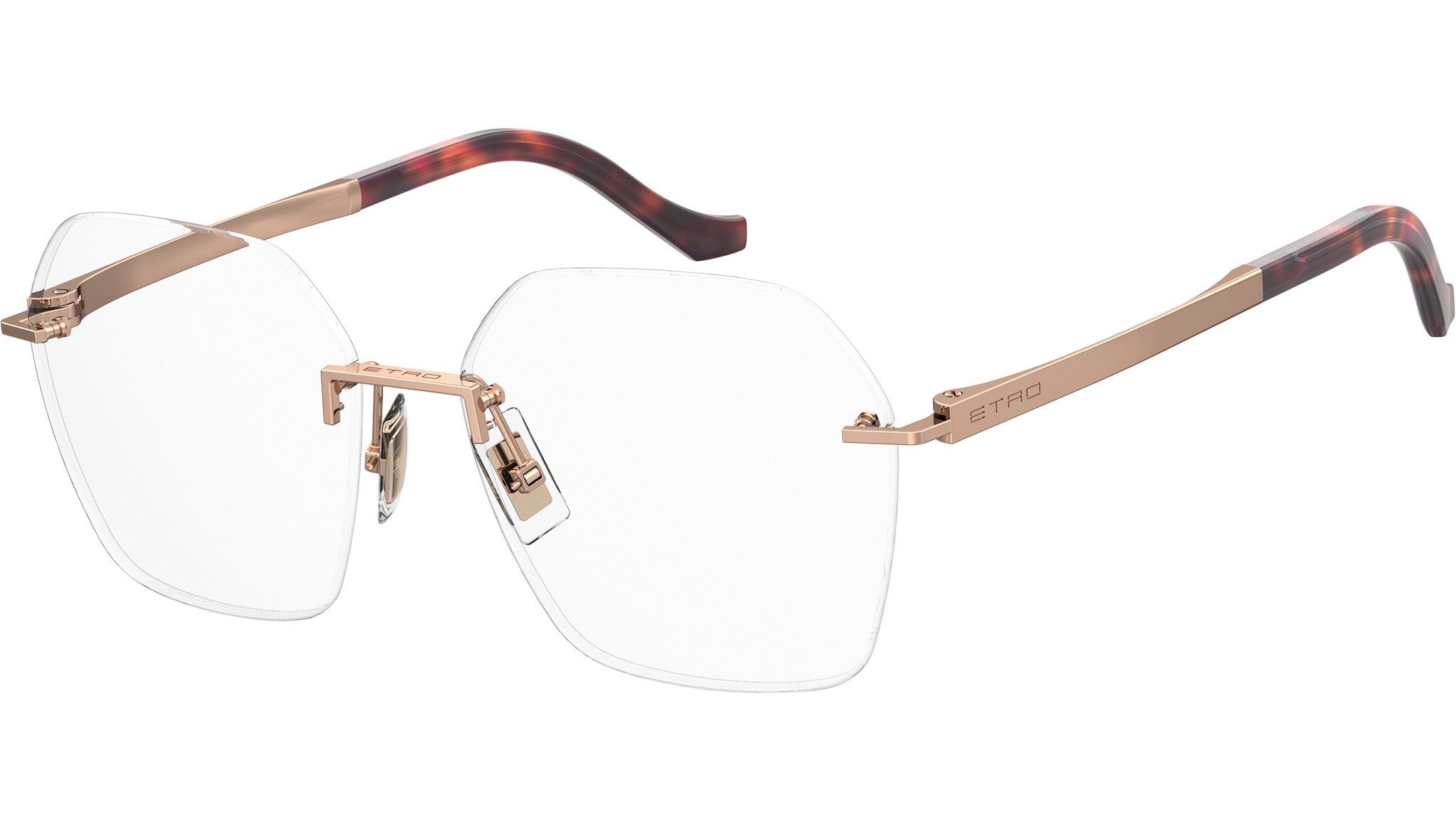 Occhiali da vista ETRO modello 0037 codice colore DDB oro rame con lenti demo La collezione di occhiali da vista ETRO "Luxury Metal" fonde linee pulite, elementi grafici distintivi e un'eleganza rilassata. Questa montatura ha una costruzione rimless leggerissima, arricchita da dettagli heritage ispirati alla borsa Vela della Maison. Il modello è caratterizzato da ponte e aste in metallo dal design geometrico, mentre i terminali iconici sono realizzati in acetato con grafismi che richiamano le stampe e i colori brillanti dei tessuti ETRO. Il modello è completato da naselli regolabili rifiniti con il logo Pegaso. Rivenditore autorizzato online ETRO Eyewear.