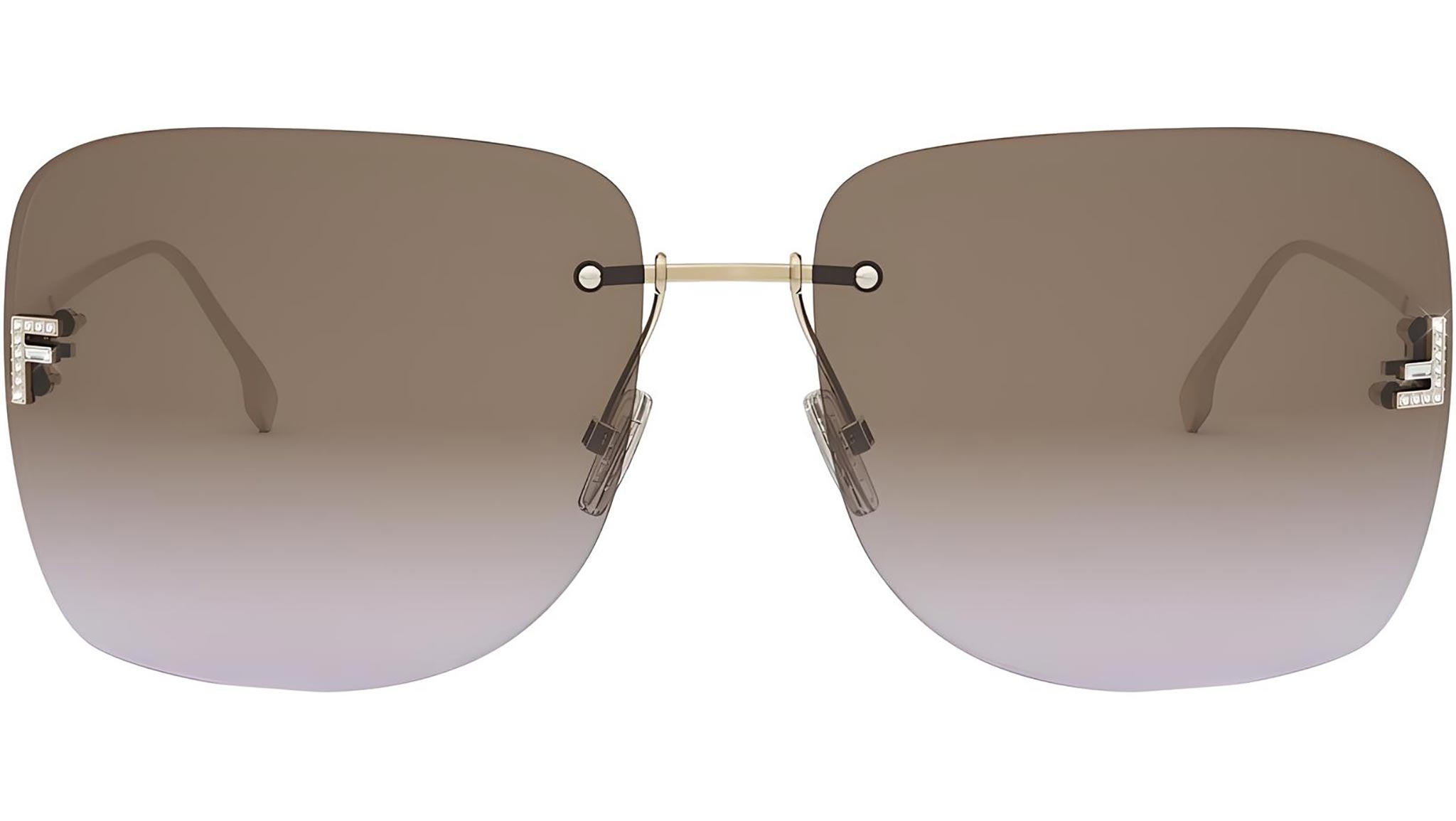 Occhiali da sole FENDI donna linea Fendi First modello FE4134US codice colore 32E oro endura lucido. Un'evoluzione dalla forma avvolgente, con dettagli in metallo, della linea Fendi First. Modello senza montatura caratterizzato da lenti sfumate, impreziosite dagli inserti con cristalli. Rivenditore autorizzato FENDI online. Gli occhiali vengono consegnati con custodia e accessori originali.