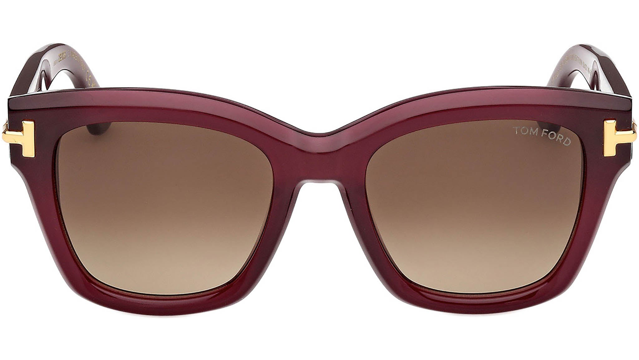 Occhiali da sole Tom Ford donna modello Icon FT1329 con montatura a farfalla full-rim in acetato viola lucido e lenti color marrone sfumato. Codice Brand: 1329. Codice colore: 81F. Rivenditore autorizzato Tom Ford online. Gli occhiali vengono consegnati con custodia e accessori originali e sono coperti da garanzia standard di 12 mesi del produttore.