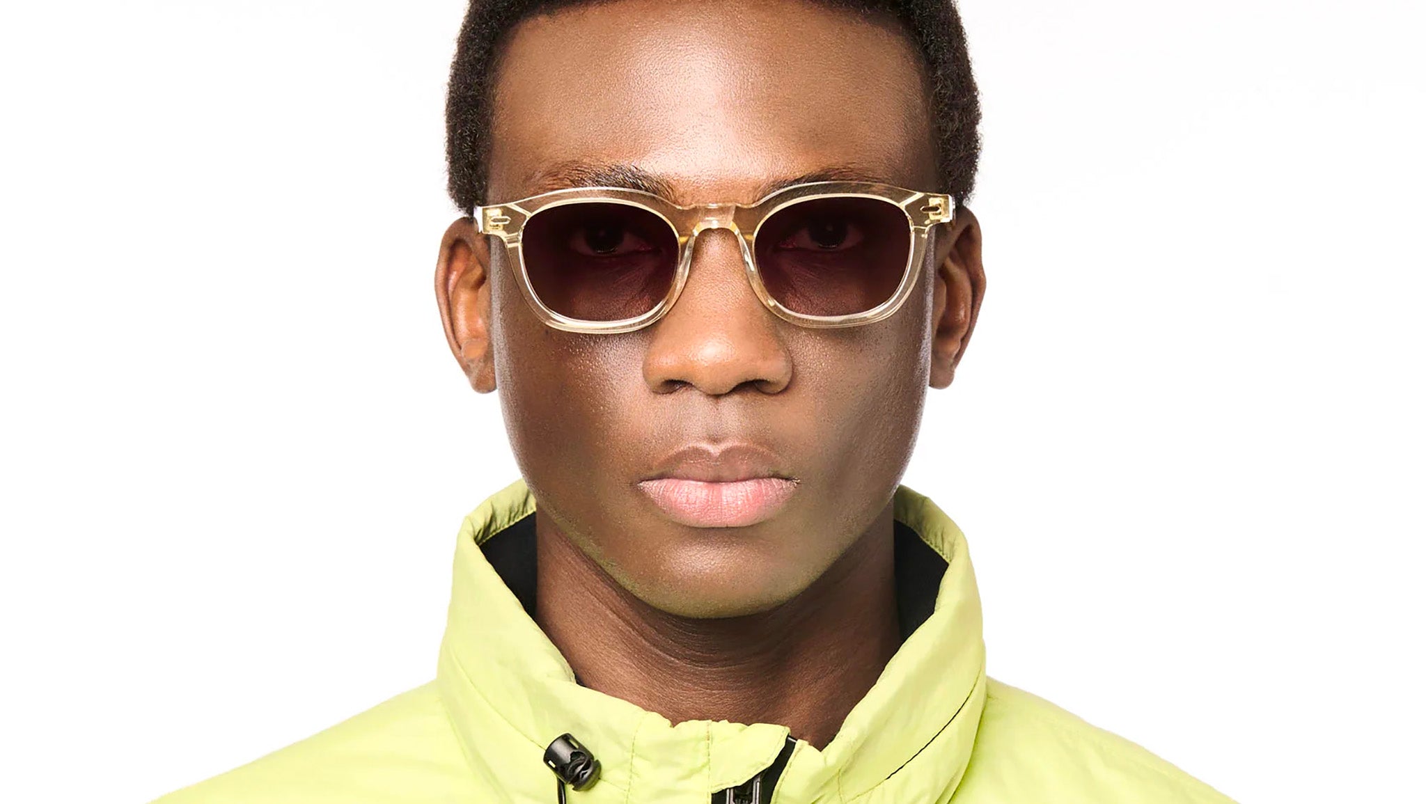 Occhiali da sole con montatura in acetato artigianale di colore champagne e lenti marrone. Materiale del telaio: acetato. Forma del telaio: panthos. Cerniere metalliche a cinque barre e nucleo in filo personalizzato. Custodia rigida premium e panno per la pulizia in microfibra.