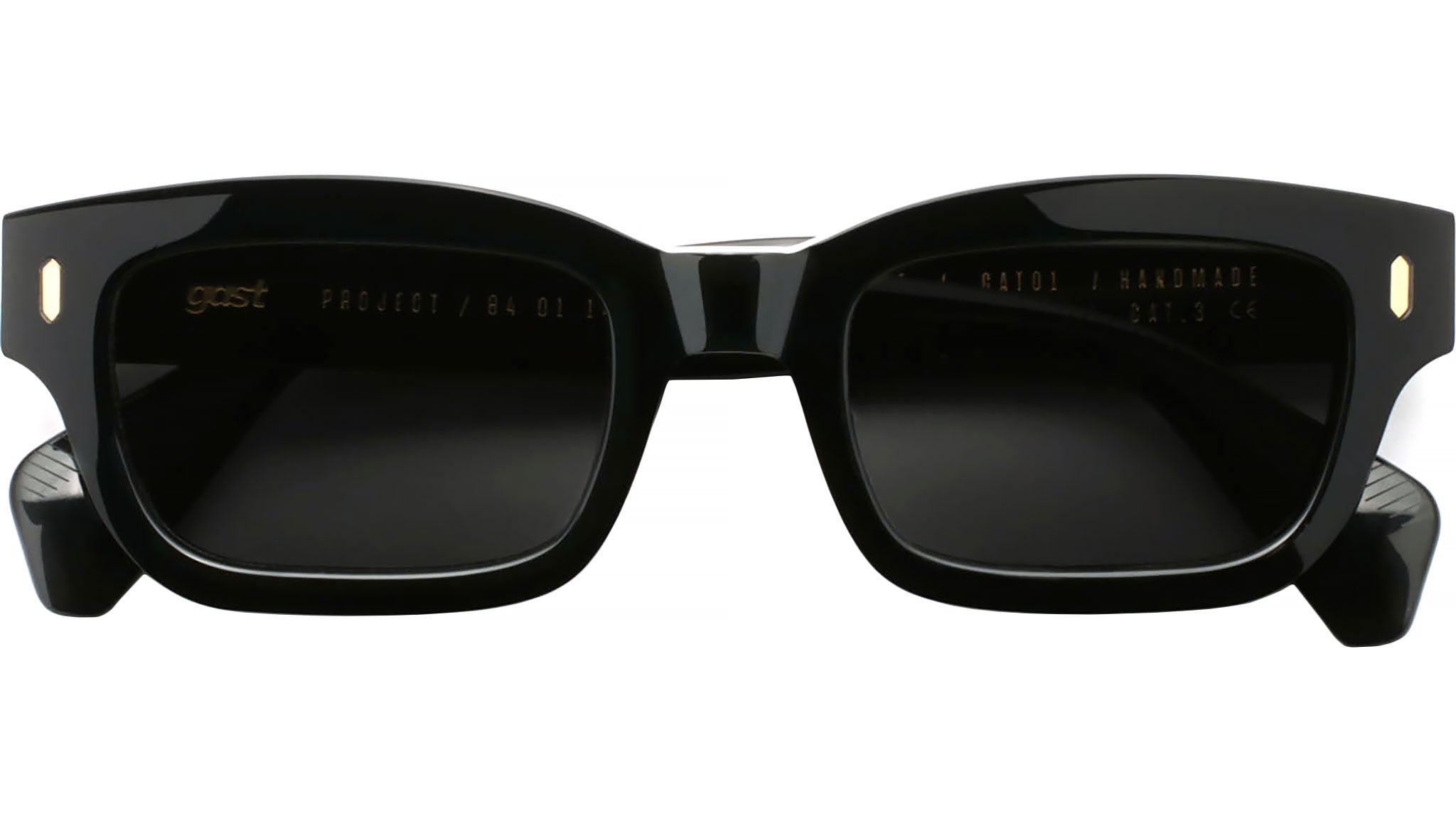 Occhiali da sole con montatura in acetato artigianale di colore nero e lenti grigio. Materiale del telaio: acetato. Forma del telaio: rettangolari. Cerniere metalliche a cinque barre e nucleo in filo personalizzato. Custodia rigida premium e panno per la pulizia in microfibra.