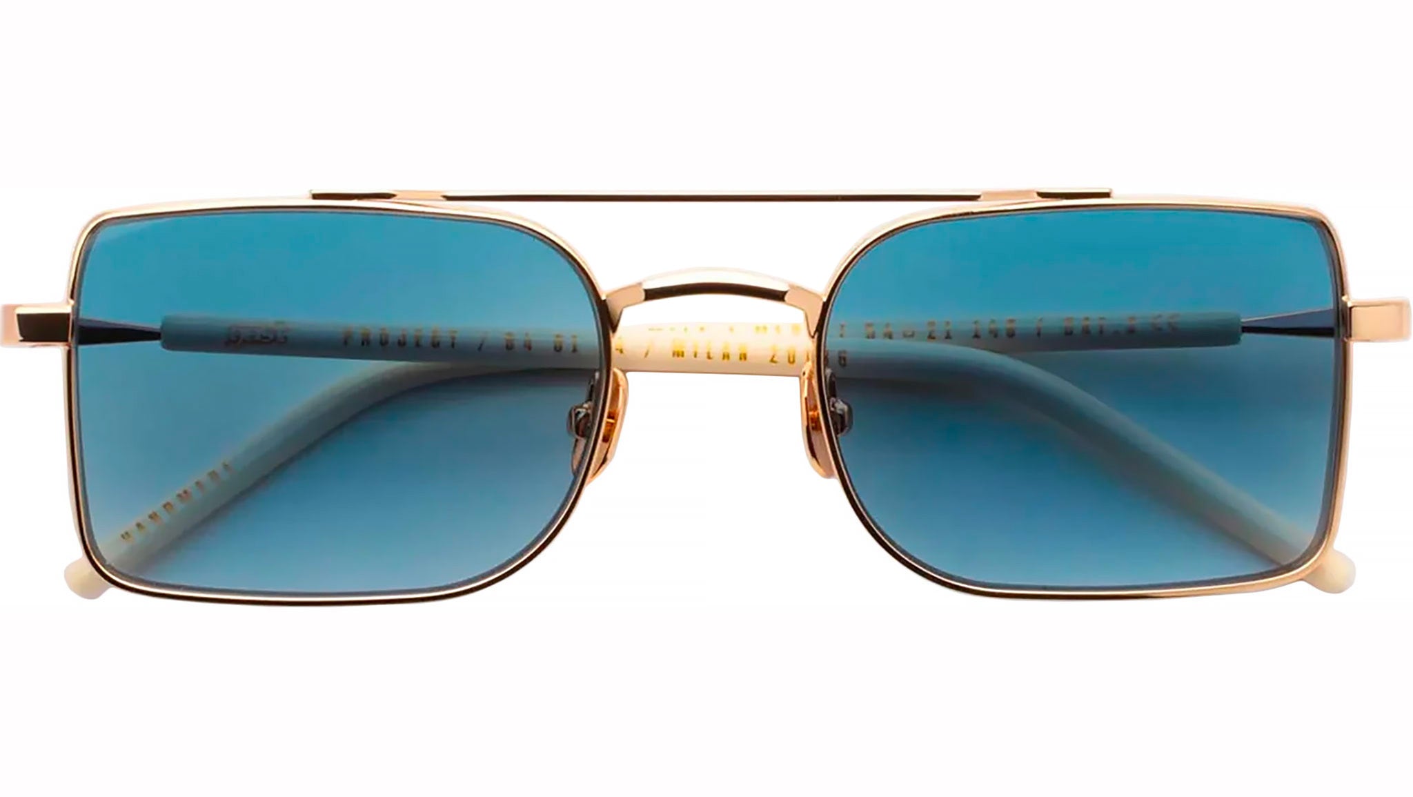 Occhiali da sole con montatura in metallo artigianale di colore oro e lenti blu. Materiale del telaio: metallo. Forma del telaio: geometrici. Cerniere metalliche a cinque barre e nucleo in filo personalizzato. Custodia rigida premium e panno per la pulizia in microfibra.