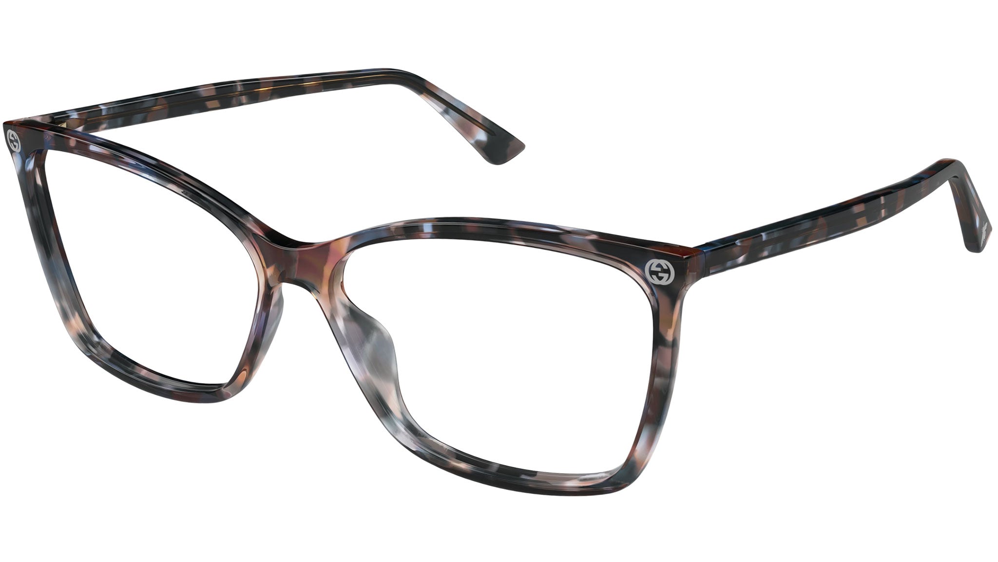 Occhiali da vista Gucci modello GG0025O linea GG Logo in acetato forma a gatto melange lucido rosso azzurro e avana nero con aste in tartaruga e lenti demo. Rivenditore autorizzato Gucci online. Gli occhiali vengono consegnati con custodia e accessori originali e sono coperti dalla garanzia ufficiale di 12 mesi del produttore.