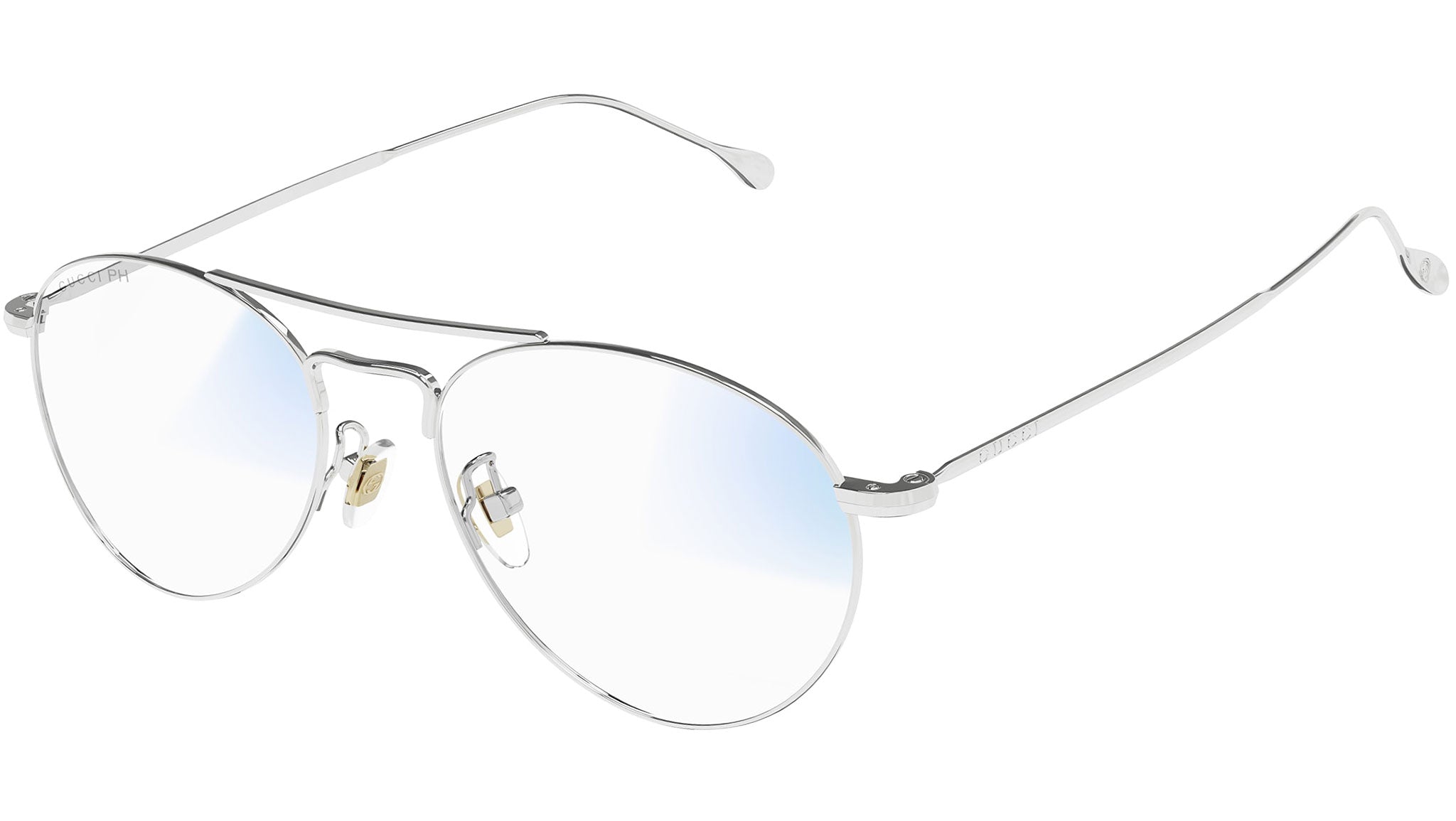Occhiali da sole Gucci Logo modello GG1187S variante colore 001 argento lucido con lenti color blu trasparente fotocromatiche + riduzione luce blu.