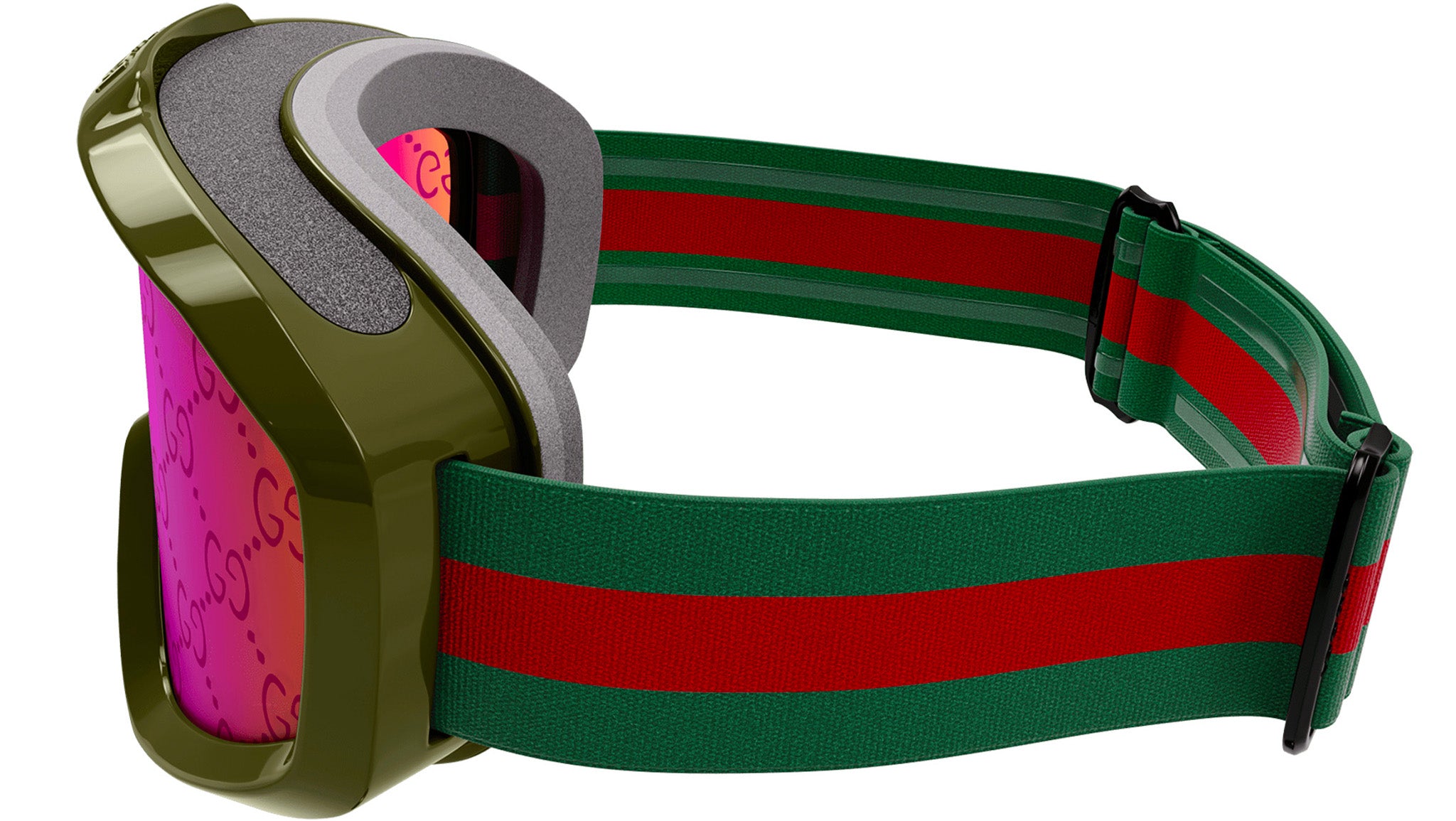 Occhiali da sole Gucci linea Seasonal Icon modello GG1210S 003 in iniettato verde scuro tinta unita lucido con aste color multicolore e lenti borgogna con logo Guccissima.