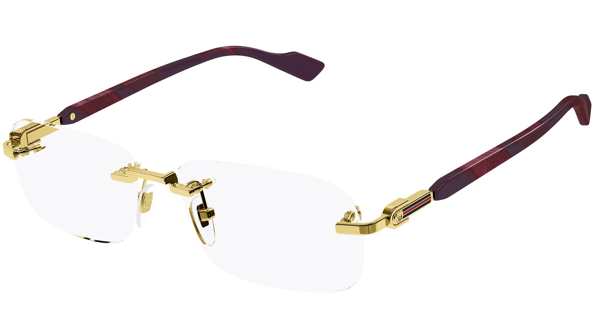 Occhiali da vista Gucci Logo modello GG1221O variante colore 003 oro giallo lucido con astine color rosso borgogna.