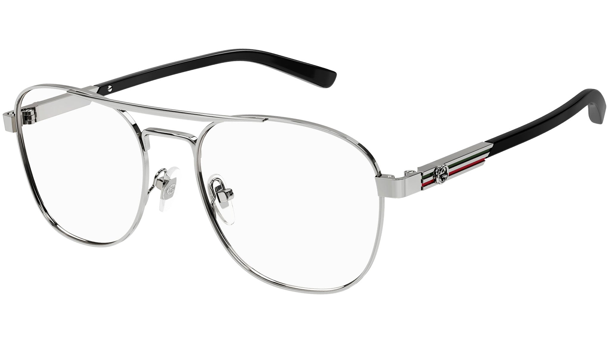 Occhiali da vista linea Gucci Logo modello GG1290O variante colore 001 rutenio chiaro lucido con astine color nero.