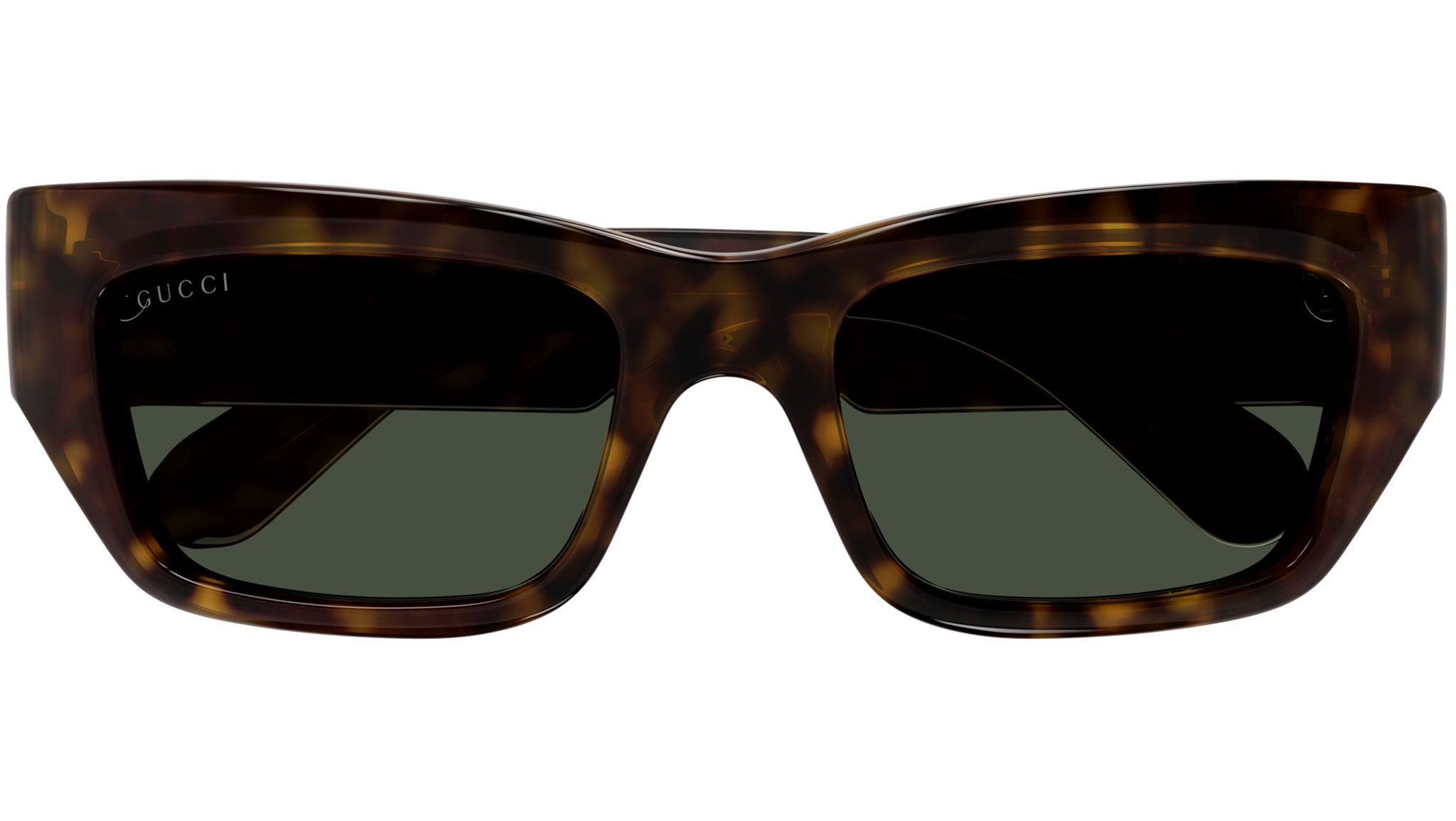Occhiali da sole Gucci modello GG1296S linea in acetato riciclato forma a gatto codice colore 004 tartaruga scuro lucido con aste tartaruga e lenti verde bottiglia tinta unita. Rivenditore autorizzato Gucci online. Gli occhiali vengono consegnati con custodia e accessori originali e sono coperti dalla garanzia ufficiale di 12 mesi del produttore.