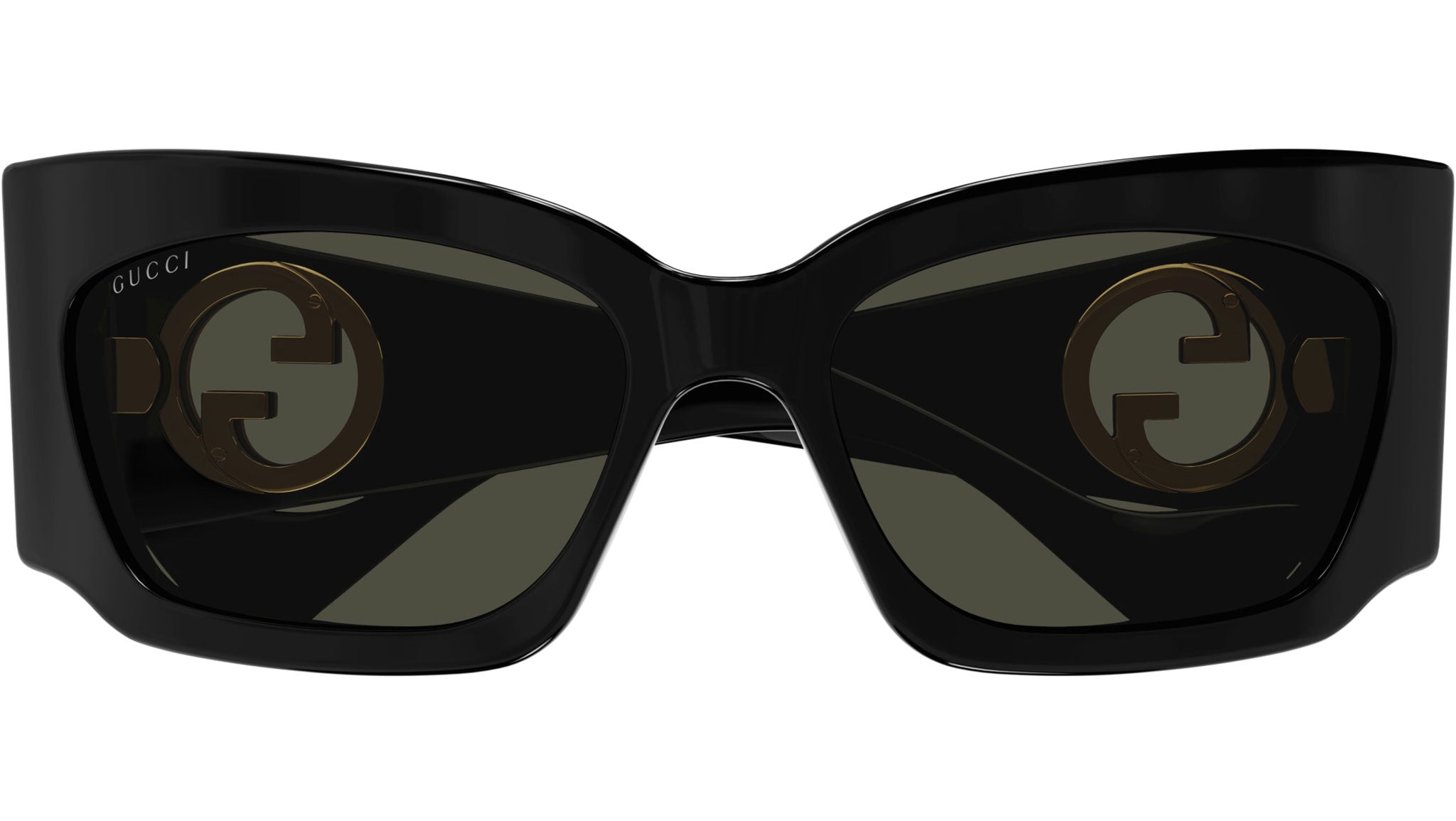 Occhiali da sole Gucci linea Fashion modello GG1412S 001 in acetato riciclato nero lucido con aste color nero e lenti grigio tinta unita.