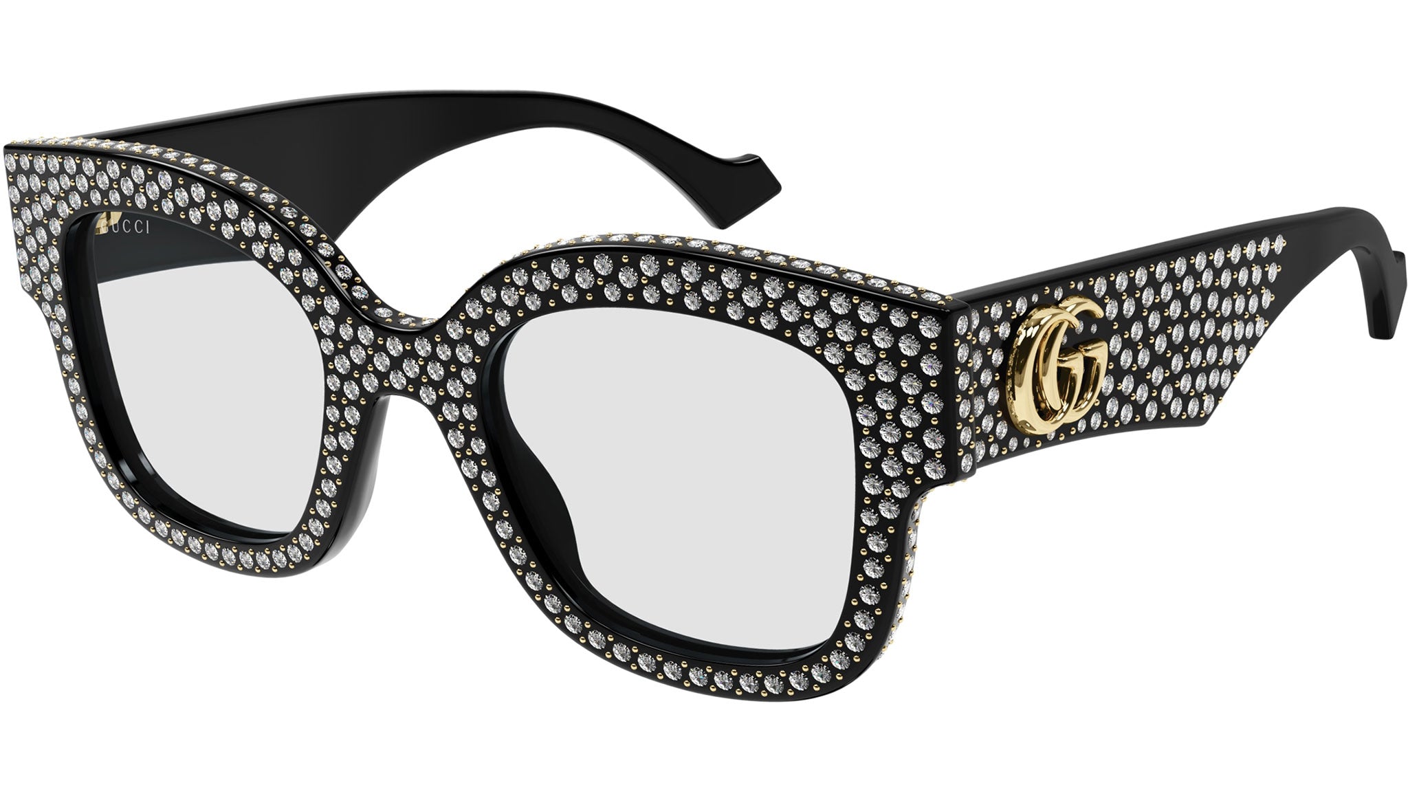 Occhiali da sole Gucci linea GG Logo modello GG1423S 001 in acetato riciclato nero tinta unita lucido con strass e borchie con aste color nero e lenti trasparente.