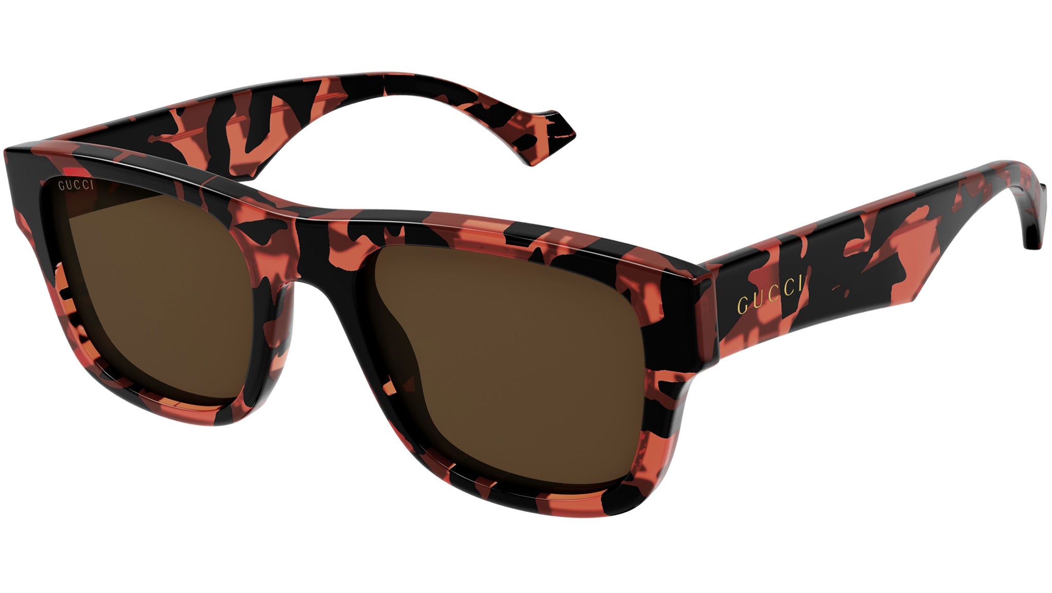 Occhiali da sole Gucci linea Lettering modello GG1427S 004 in acetato riciclato corallo striato maculato con aste color tartaruga e lenti marrone scuro tinta unita.