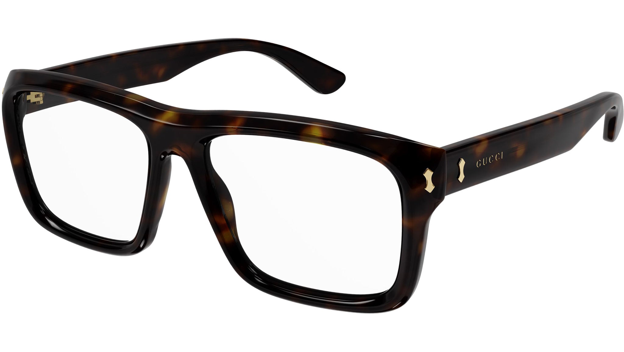 Occhiali da vista Gucci linea Rivets modello GG1462O 002 in acetato riciclato avana lucido classico con aste color tartaruga e lenti demo.