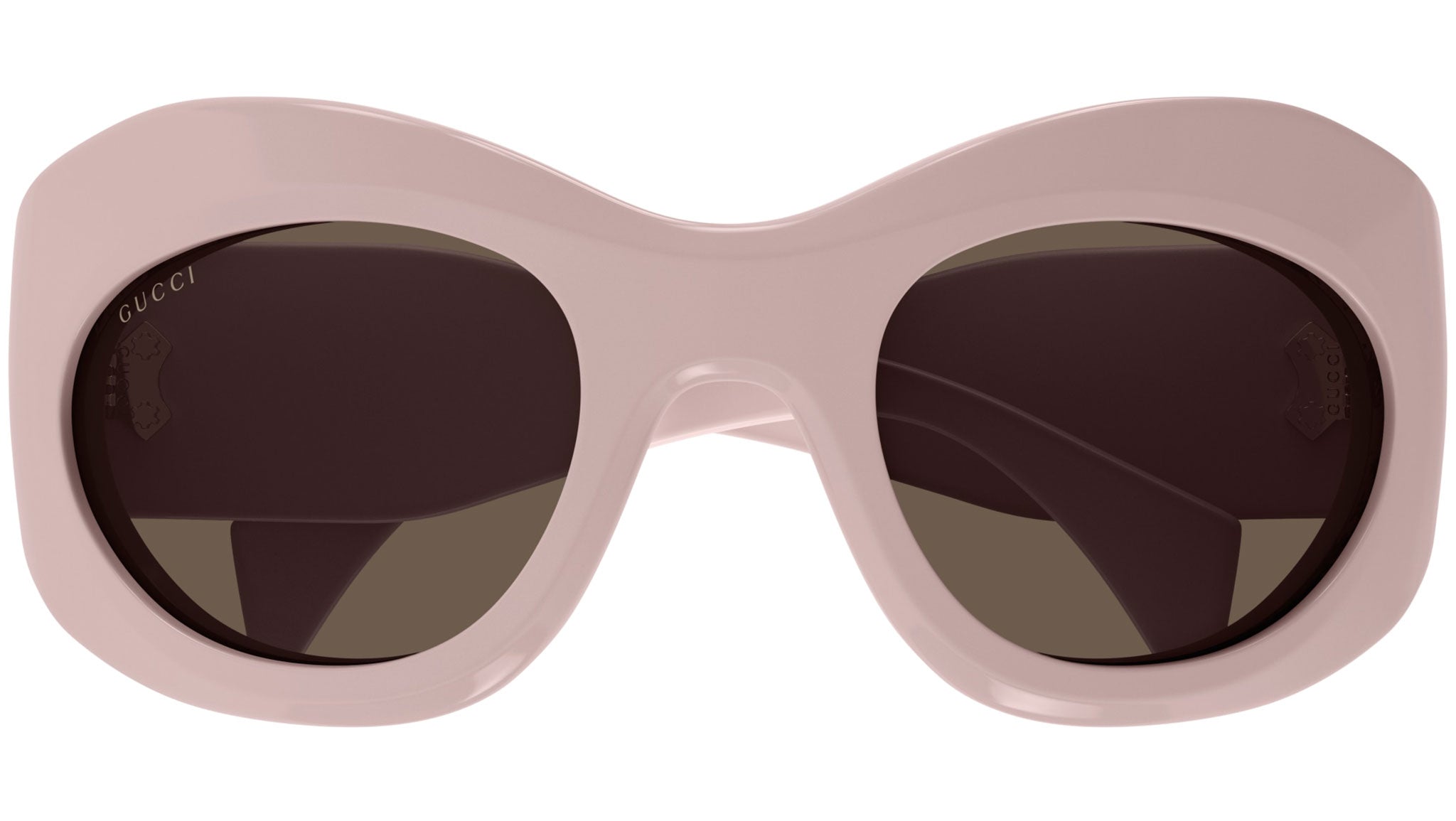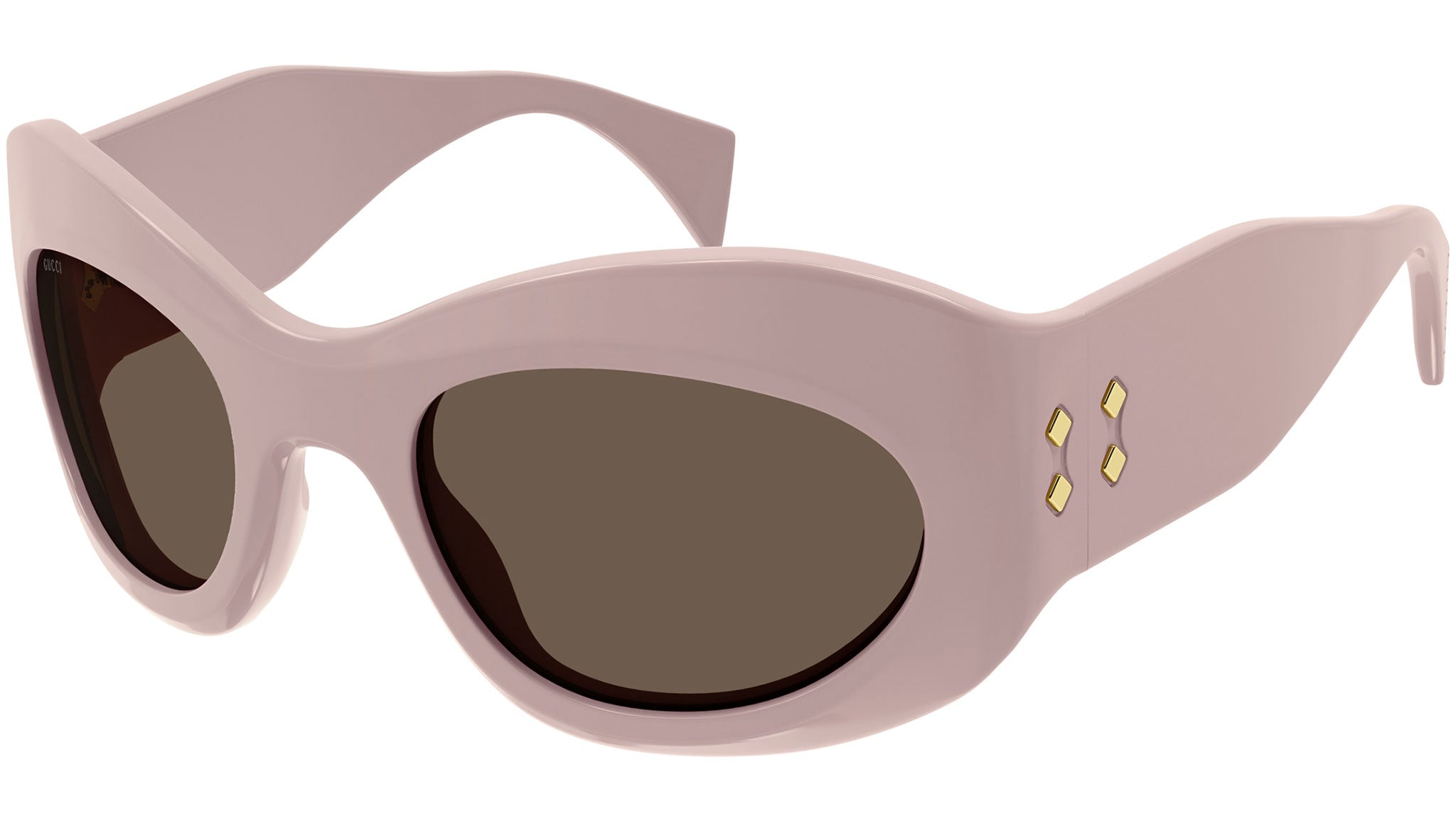Occhiali da sole Gucci linea Fashion modello GG1463S 003 in acetato riciclato rosa chiaro tinta unita lucido con aste color rosa e lenti marrone tinta unita.