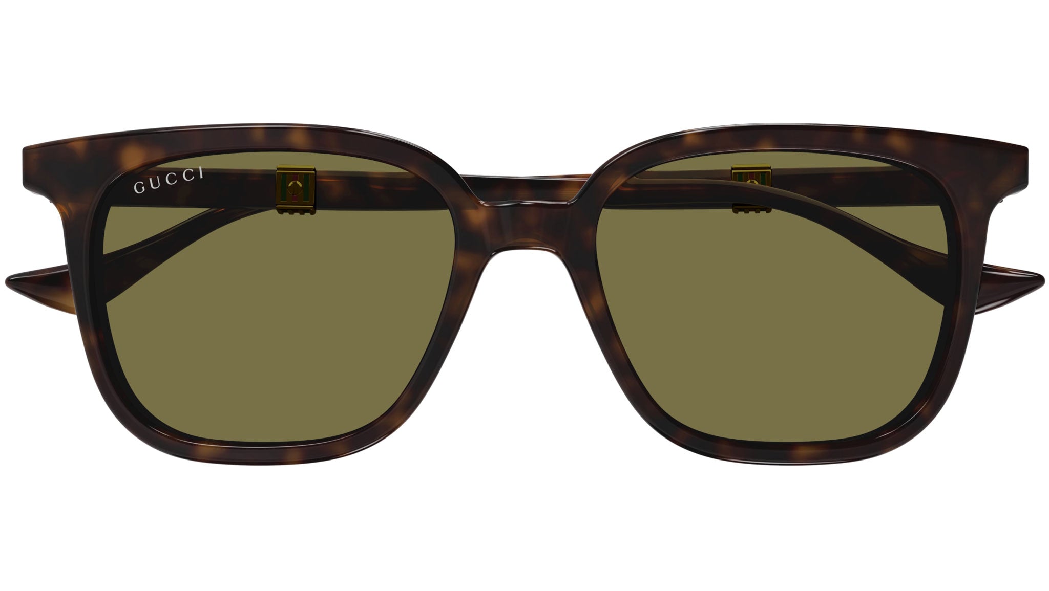 Occhiali da sole Gucci linea Web modello GG1493S rettangolari in acetato riciclato codice colore 002 tartaruga scuro lucido con aste tartaruga e lenti color verde tinta unita.