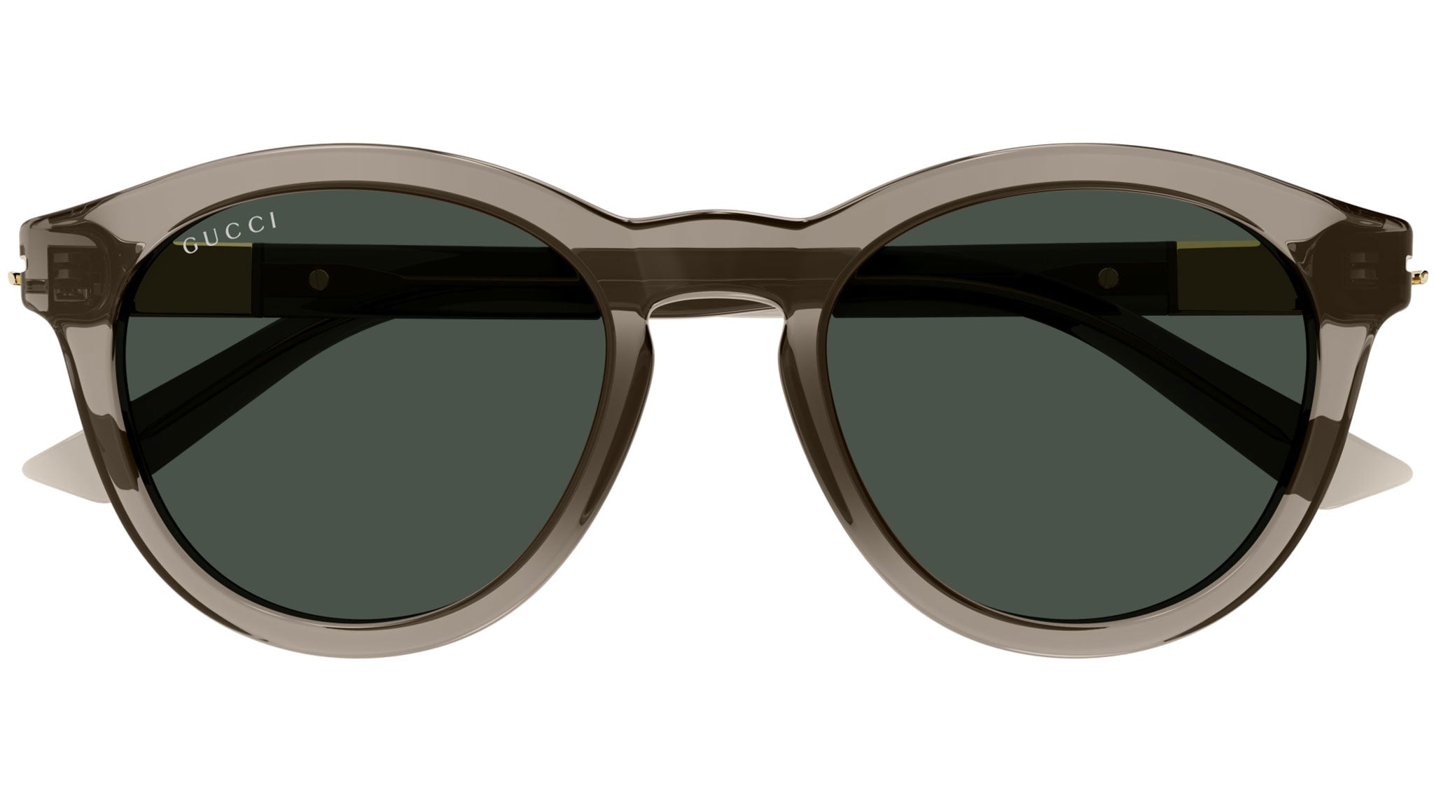 Occhiali da sole Gucci linea Web modello GG1501S pantos in acetato riciclato codice colore 004 marrone trasparente lucido con aste marrone e lenti color verde tinta unita.