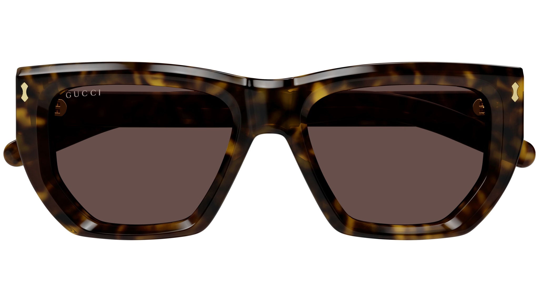 Occhiali da sole Gucci linea Rivets modello GG1520S geometrici in acetato riciclato codice colore 002 tartaruga scuro lucido con aste tartaruga e lenti color marrone tinta unita.